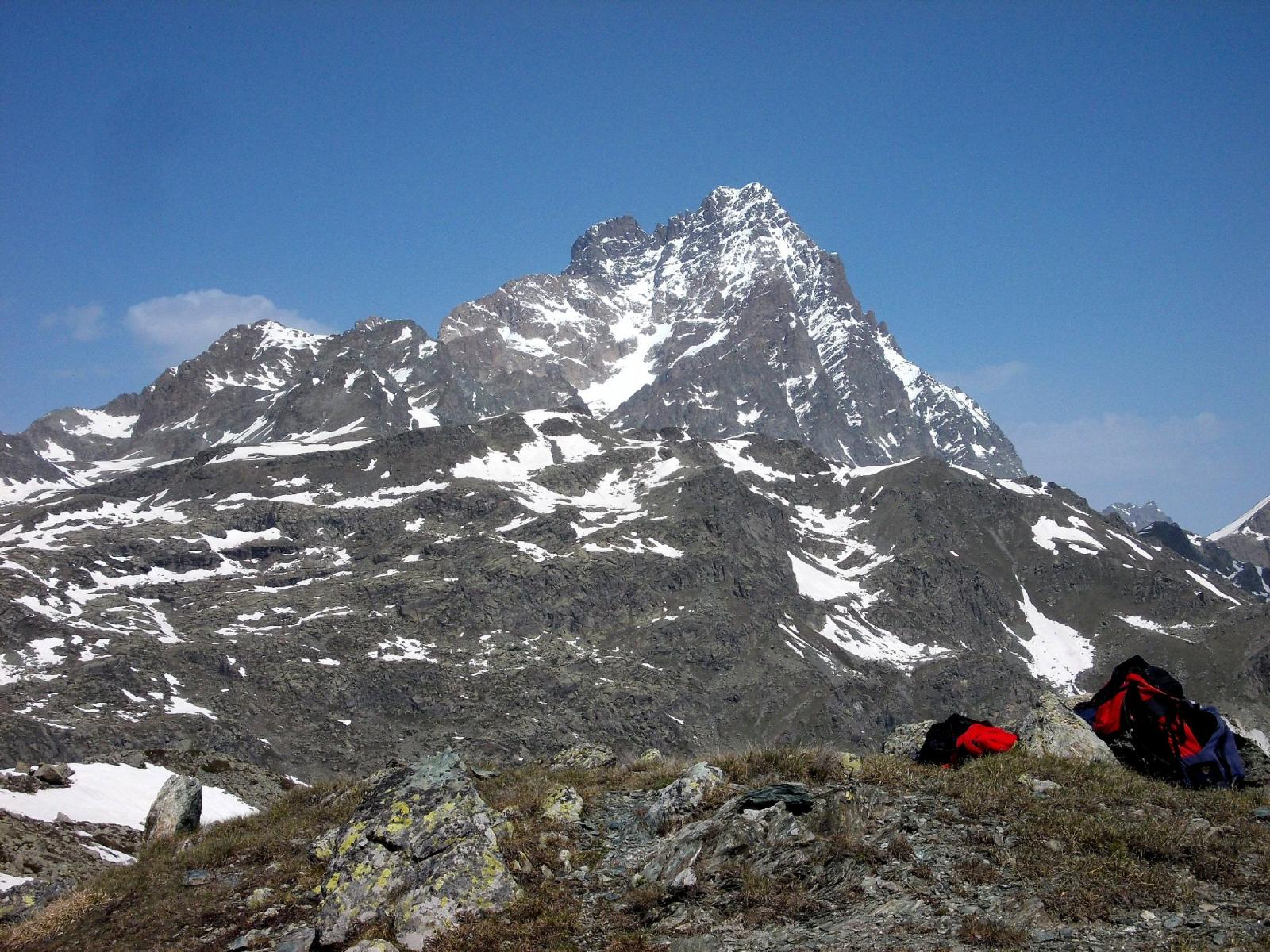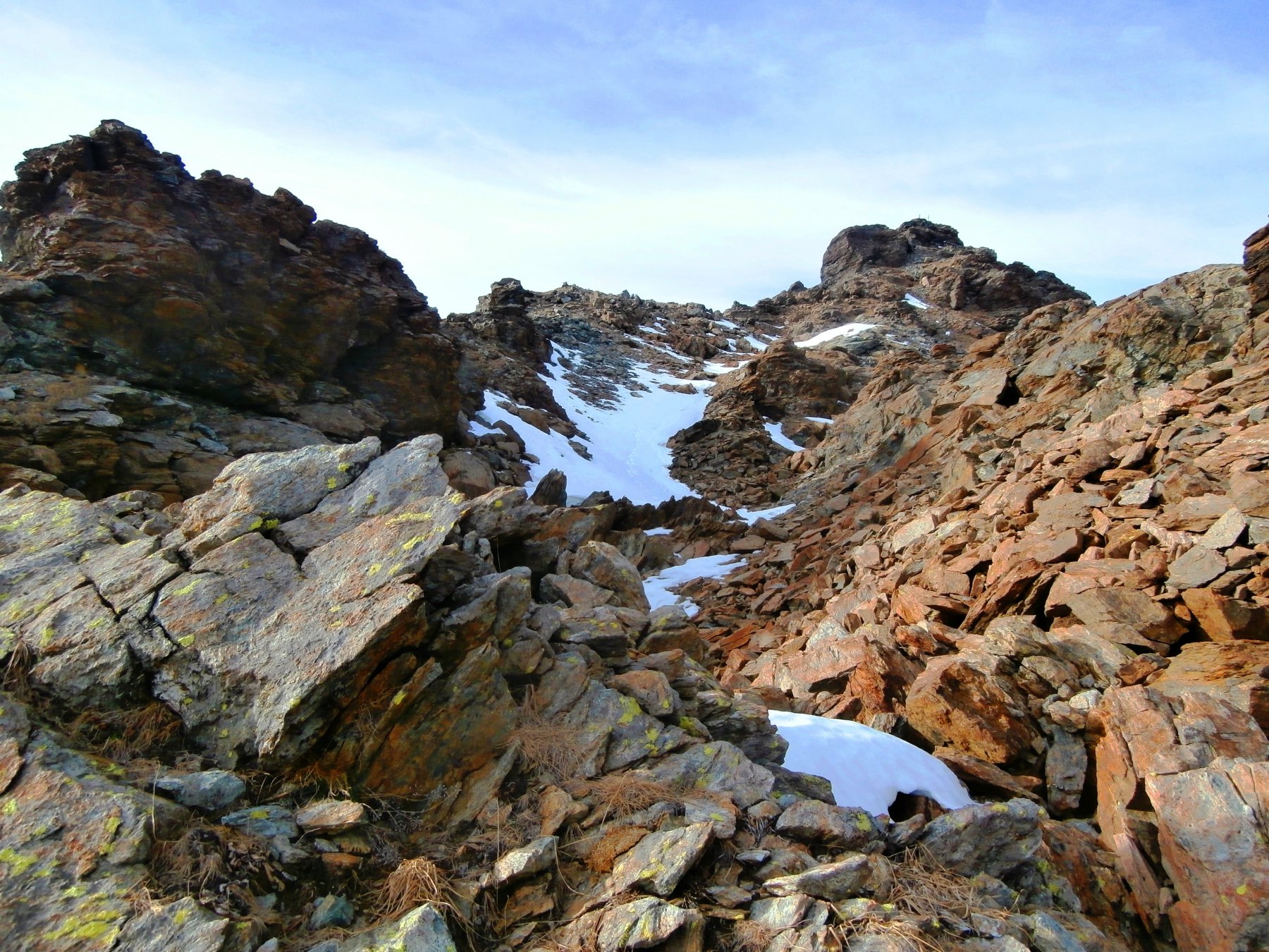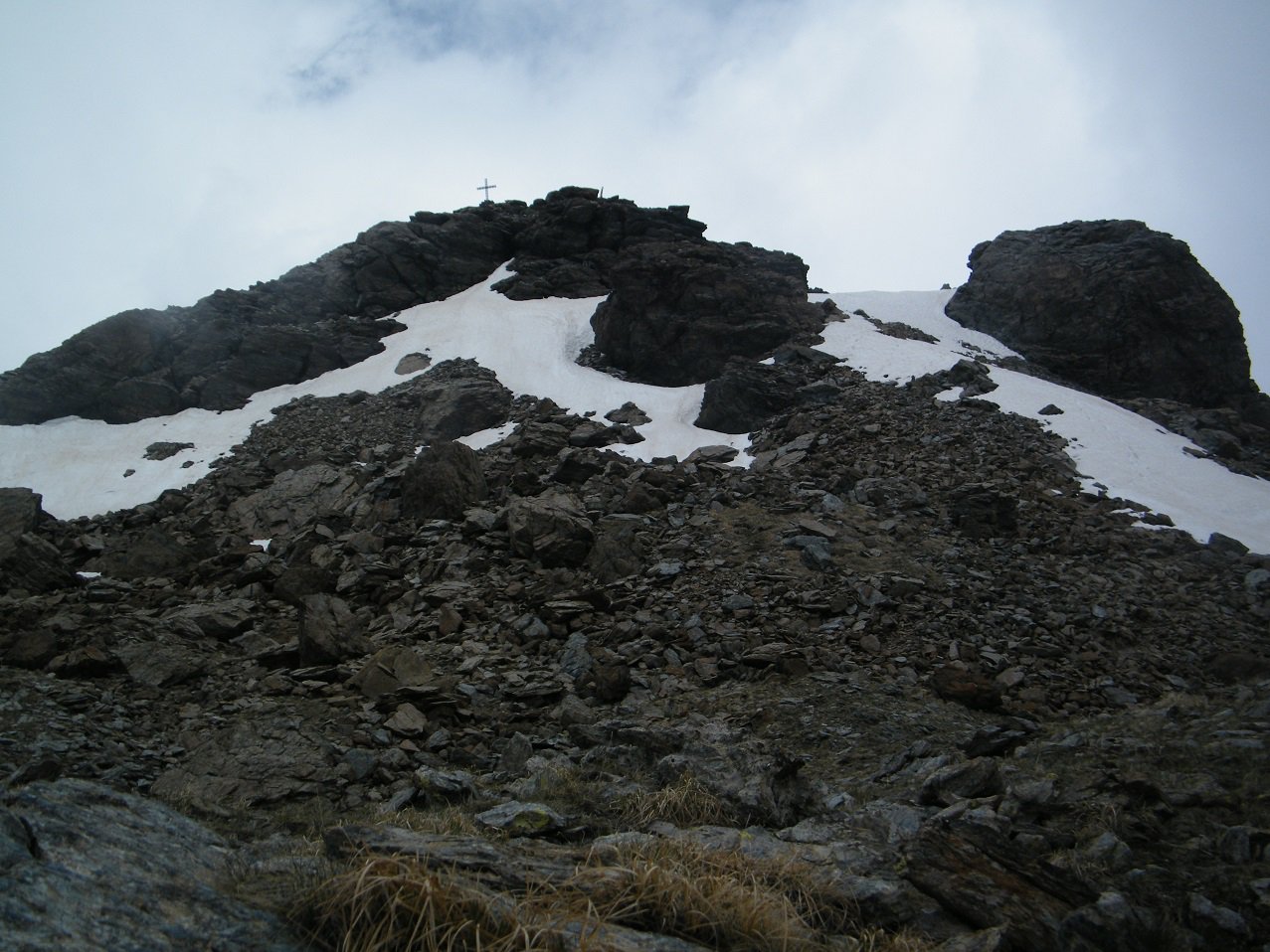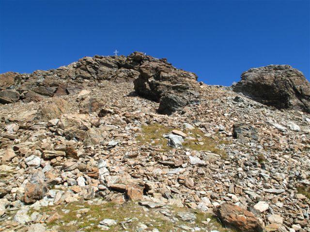 Si scende a sinistra e per l’ampia cresta si arriva al Colle di Luca. Dal colle risalire il crestone su detriti e blocchi nel primo tratto, tenendosi a destra di un enorme masso, poi su terreno elementare di erba e detriti si arriva sotto il castello roccioso sommitale che si può salire senza difficoltà indifferentemente da destra o da sinistra (EE dal Colle di Luca).