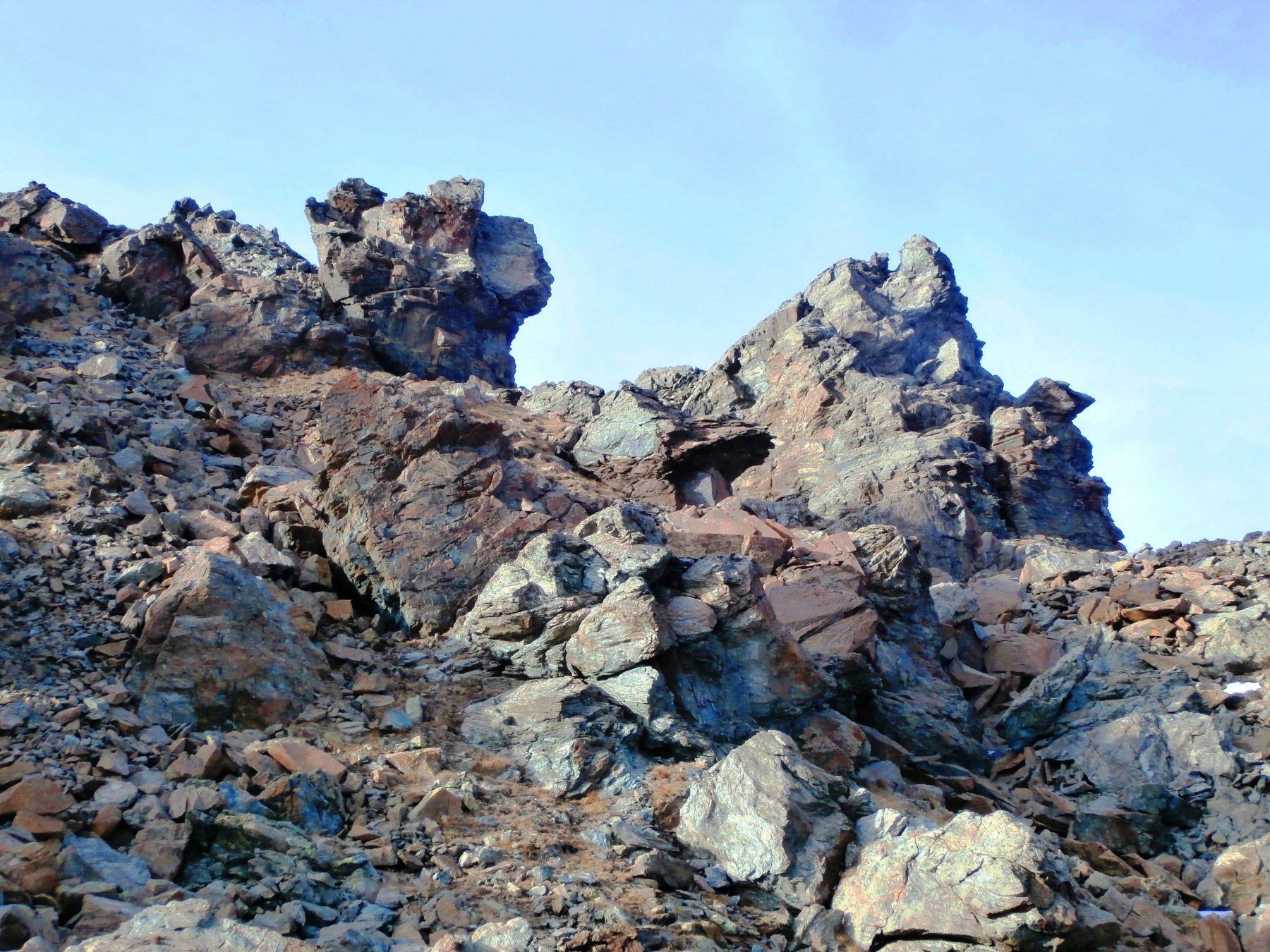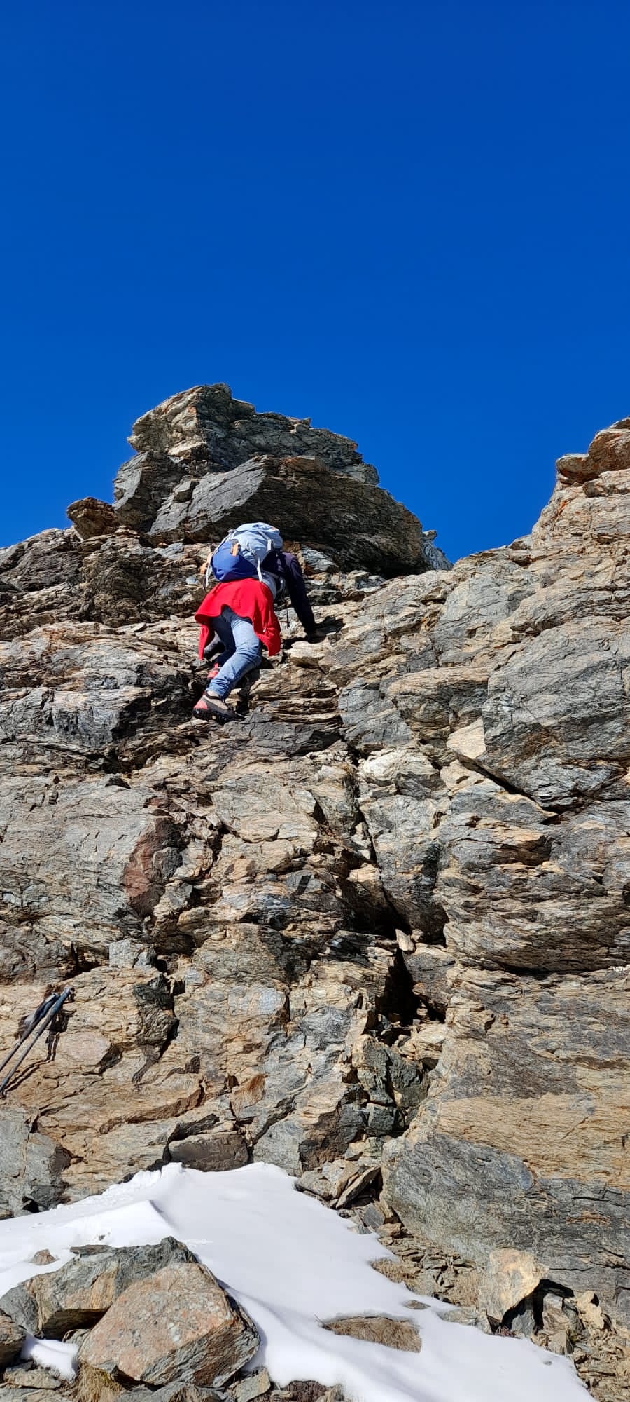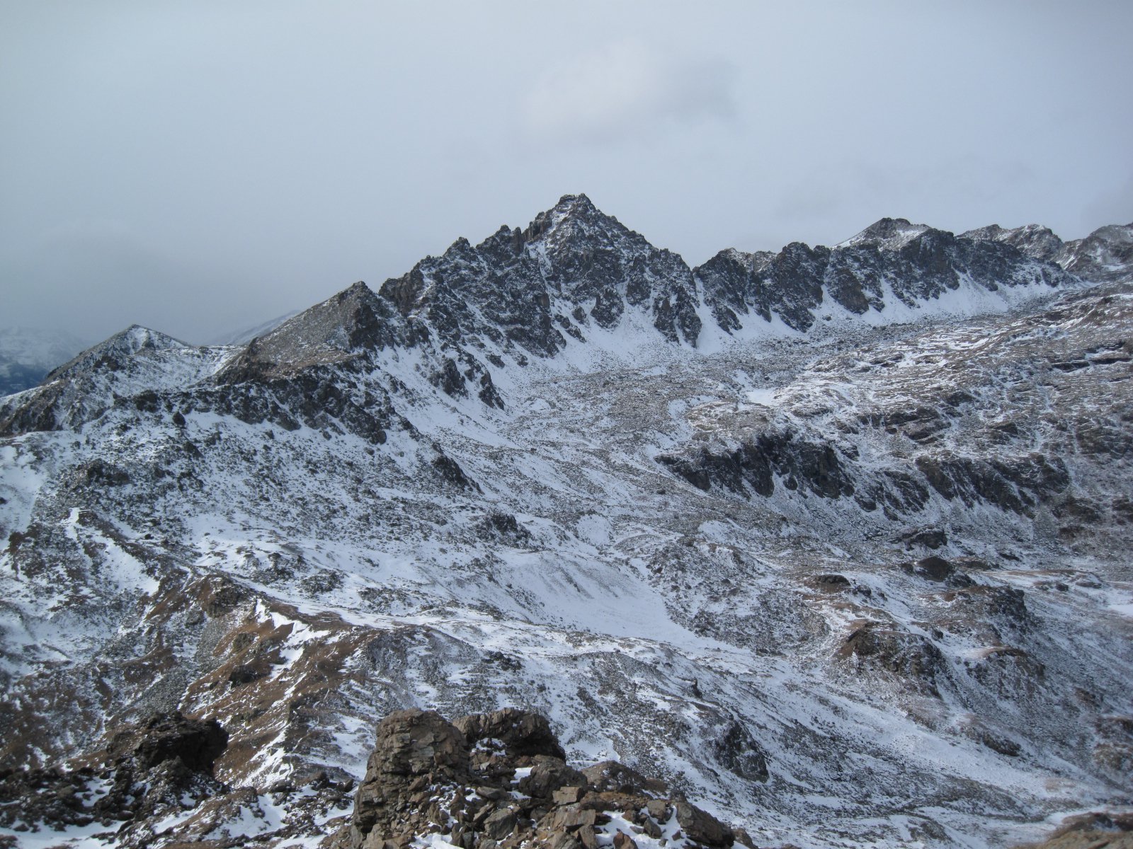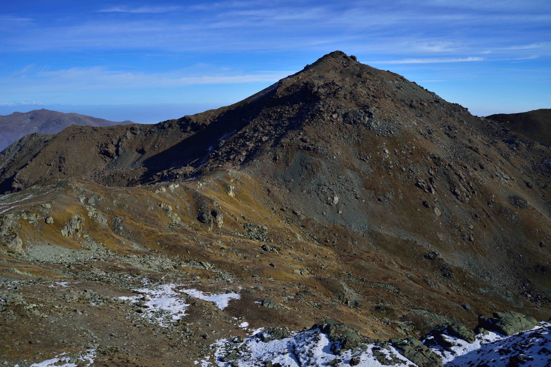 Si scende a sinistra e per l’ampia cresta si arriva al Colle di Luca. Dal colle risalire il crestone su detriti e blocchi nel primo tratto, tenendosi a destra di un enorme masso, poi su terreno elementare di erba e detriti si arriva sotto il castello roccioso sommitale che si può salire senza difficoltà indifferentemente da destra o da sinistra (EE dal Colle di Luca).