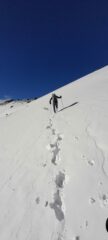 Si pesta poca neve. Un po di piu’ quando ormai in prossimita’ del lago di Luca, ora coperto da ghiaccio con neve sopra, da non sembrare neanche ci sia un lago qui attorno. Giunti alla dorsale si scende parecchio per giungere al colle di Luca.