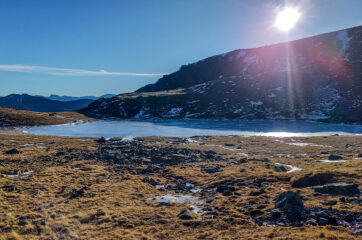 Vento a raffiche violente nell’ultimo tratto verso la cima. Splendido panorama, suggestivo il lago completamente gelato ma senza neve