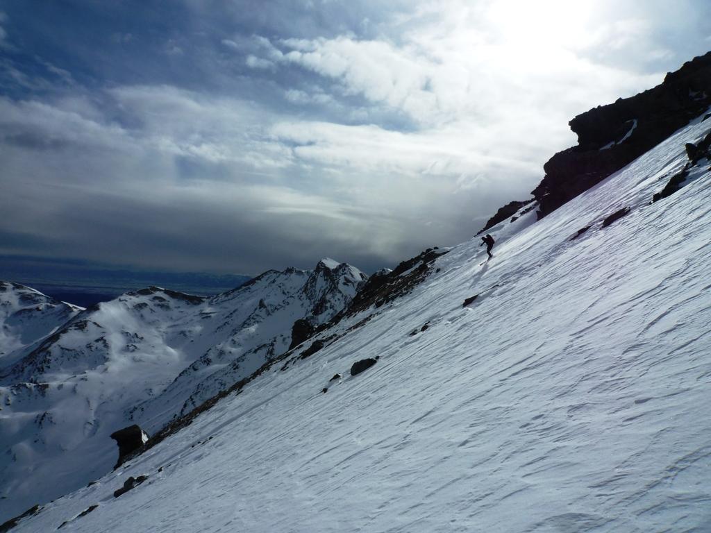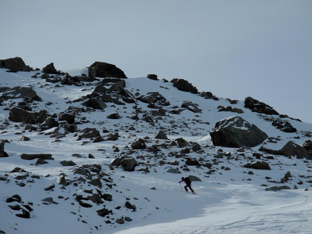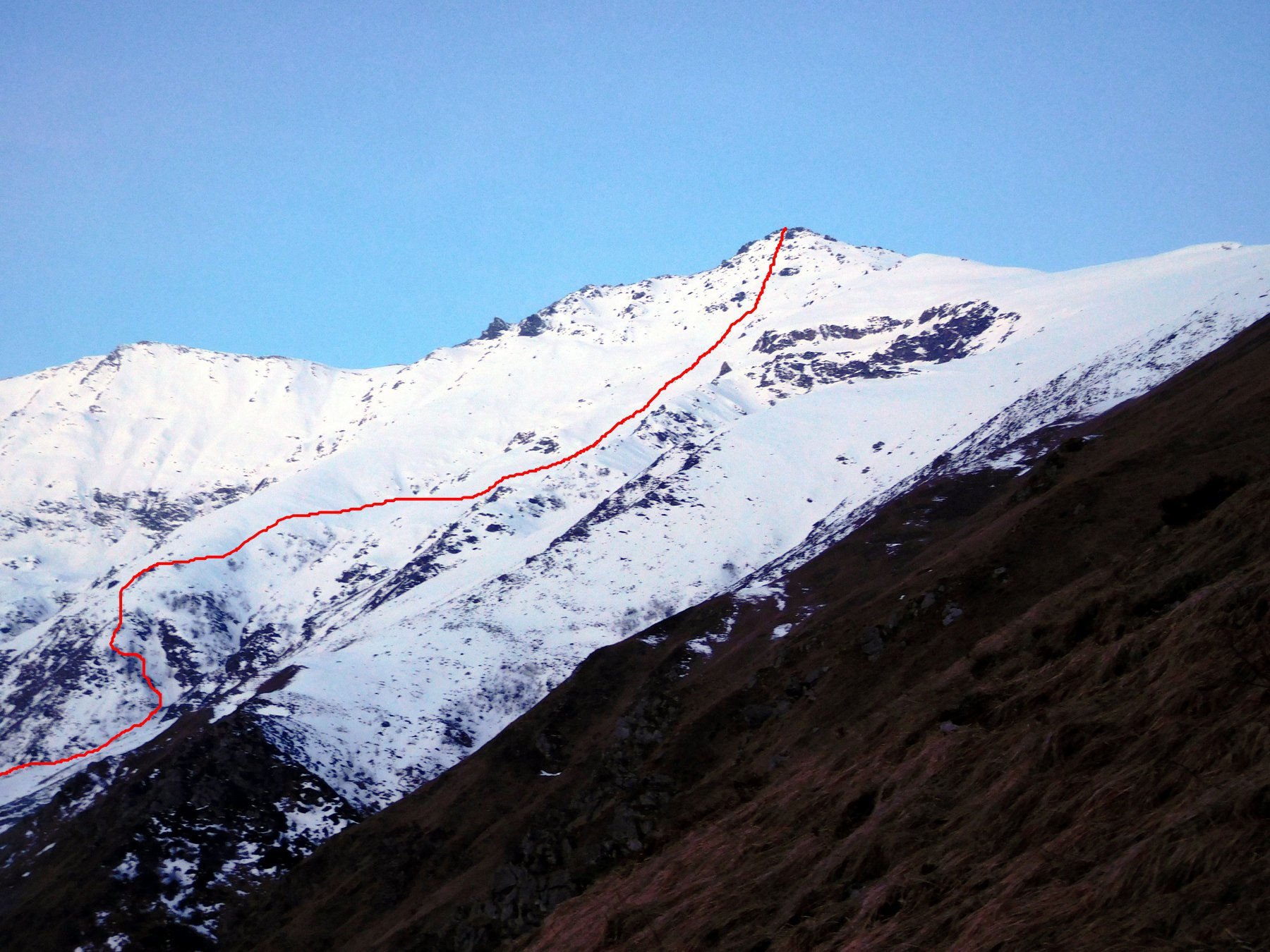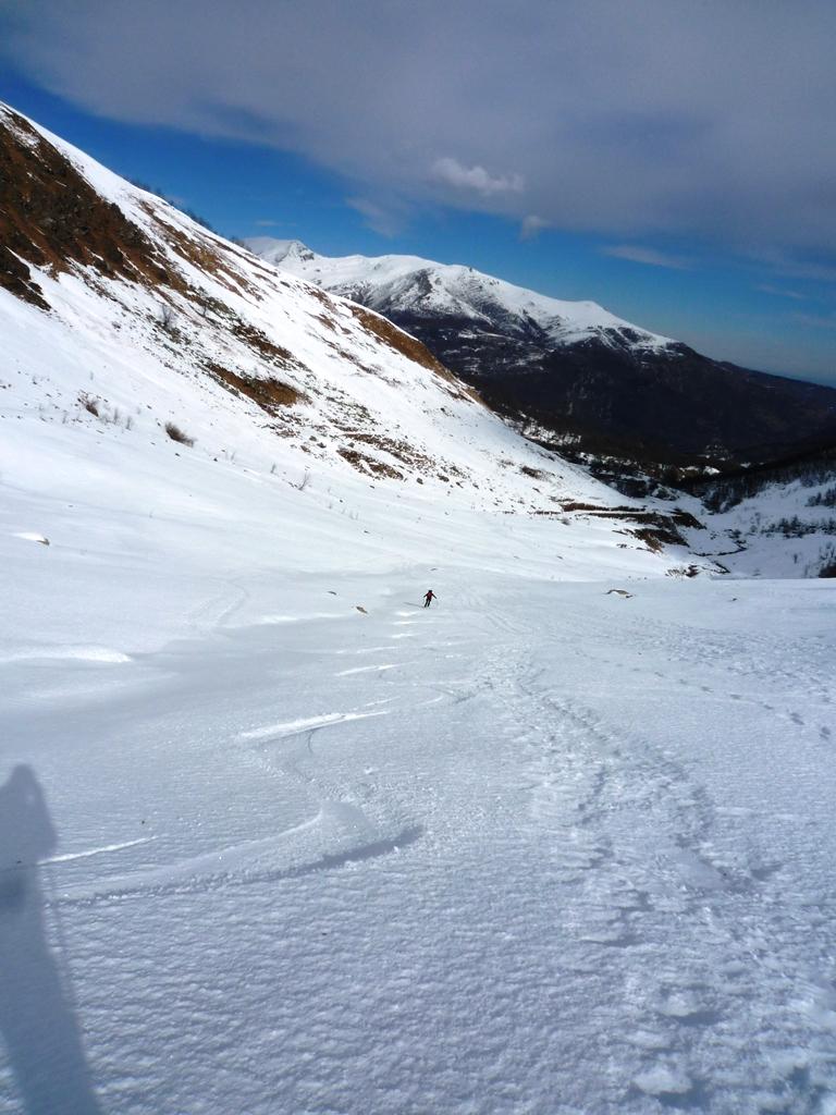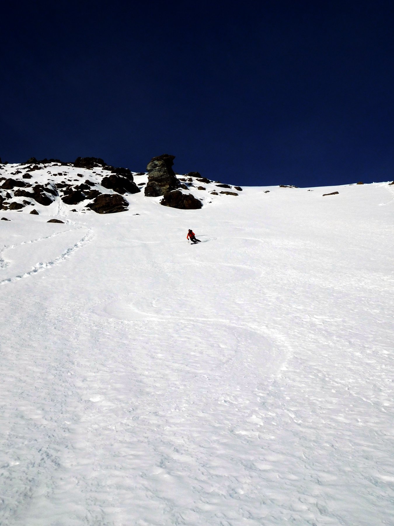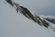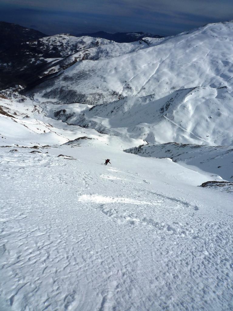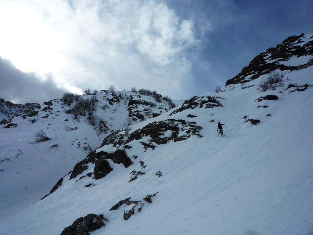 La parte alta dell’itinerario che parte pochi metri sotto la croce di vetta é abbastanza esposta, oggi con innevamento non molto abbondante dopo i primi 20 metri di discesa è stato necessario togliere gli sci per un paio di metri per attraversare alcune rocce. La pendenza raggiunge i 45° per i primi 100 metri , poi molla un poco , circa 40°. Da questo punto in poi sempre seguendo la linea di massima pendenza si scende in un canale appena accennato e poi più in basso nella gorgia.