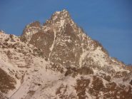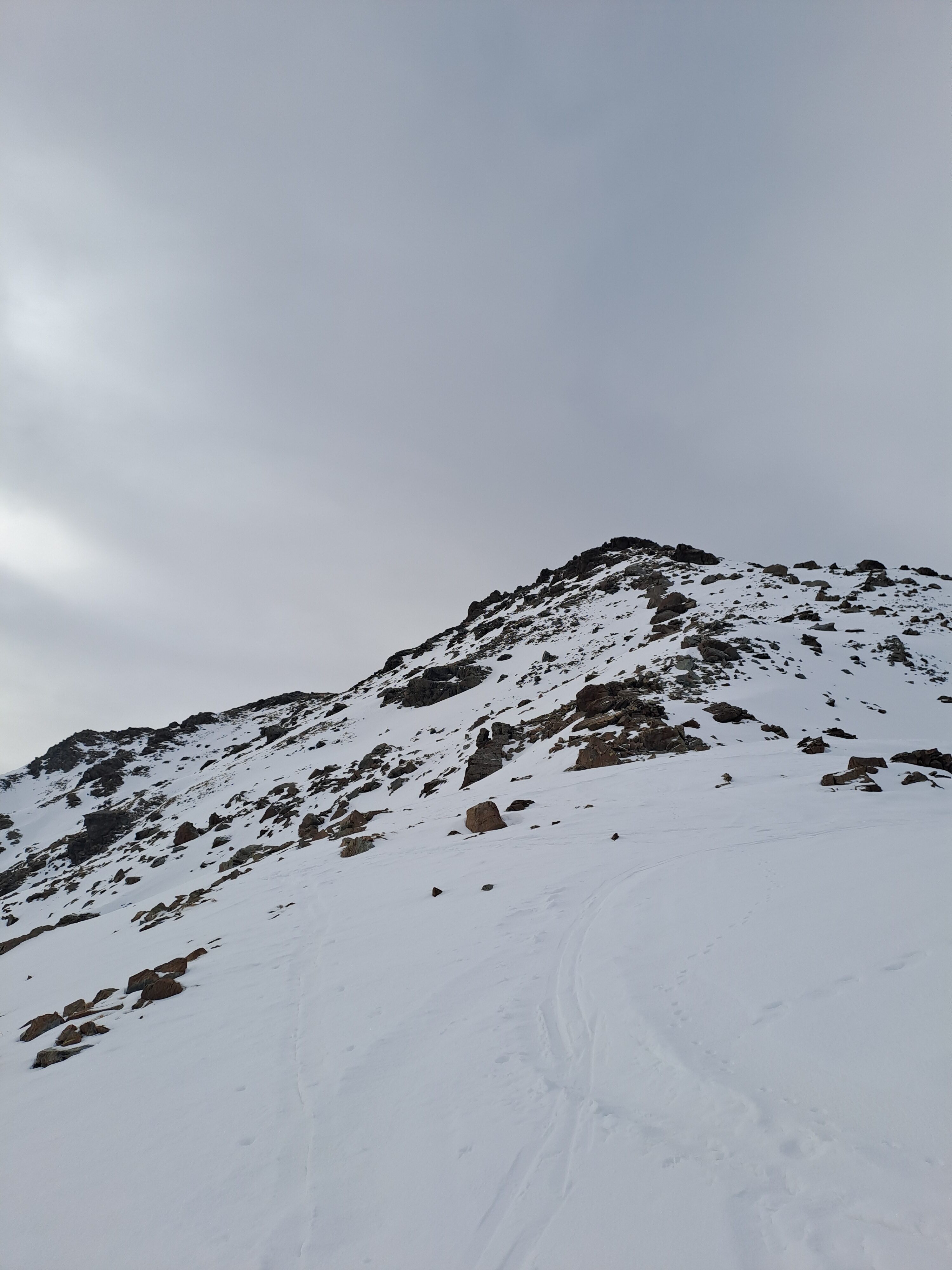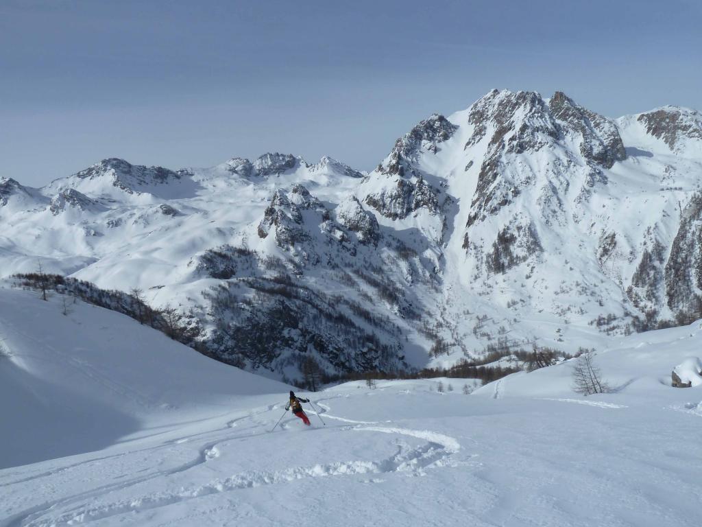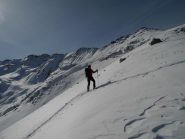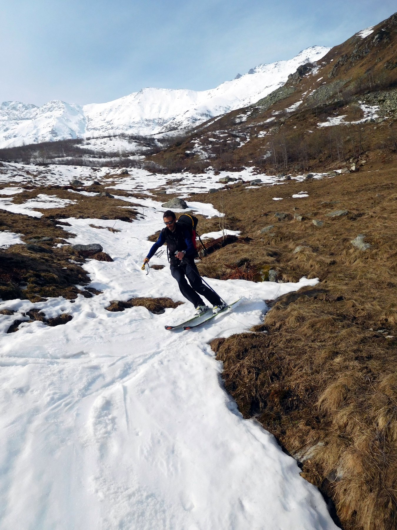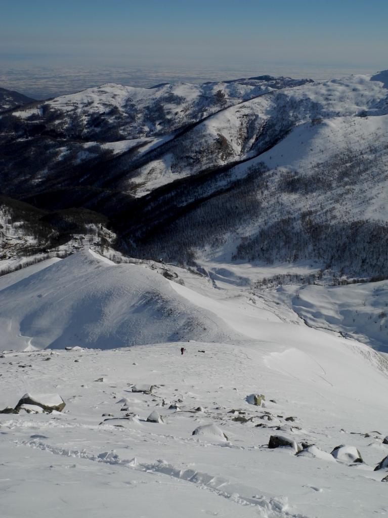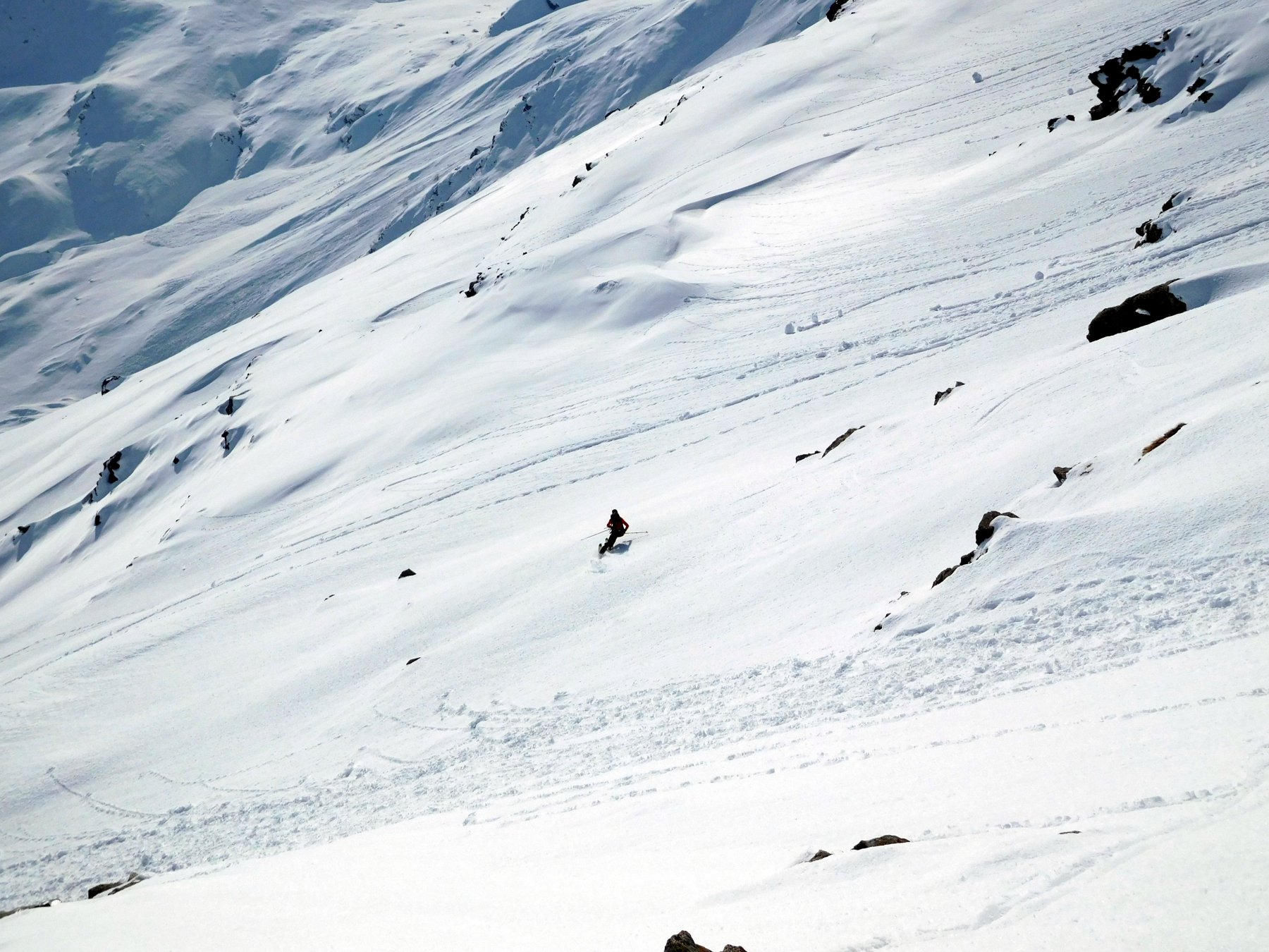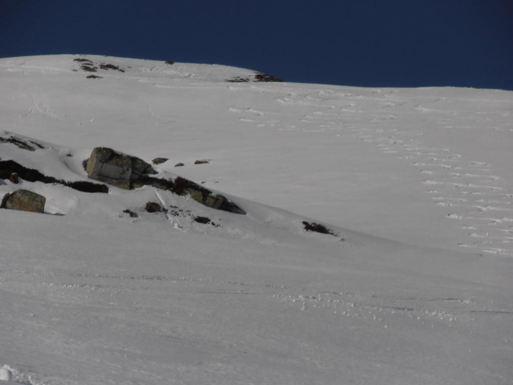 La parte alta dell’itinerario che parte pochi metri sotto la croce di vetta é abbastanza esposta, oggi con innevamento non molto abbondante dopo i primi 20 metri di discesa è stato necessario togliere gli sci per un paio di metri per attraversare alcune rocce. La pendenza raggiunge i 45° per i primi 100 metri , poi molla un poco , circa 40°. Da questo punto in poi sempre seguendo la linea di massima pendenza si scende in un canale appena accennato e poi più in basso nella gorgia.