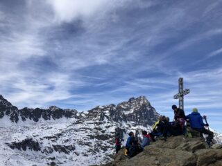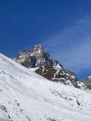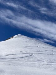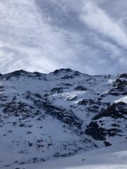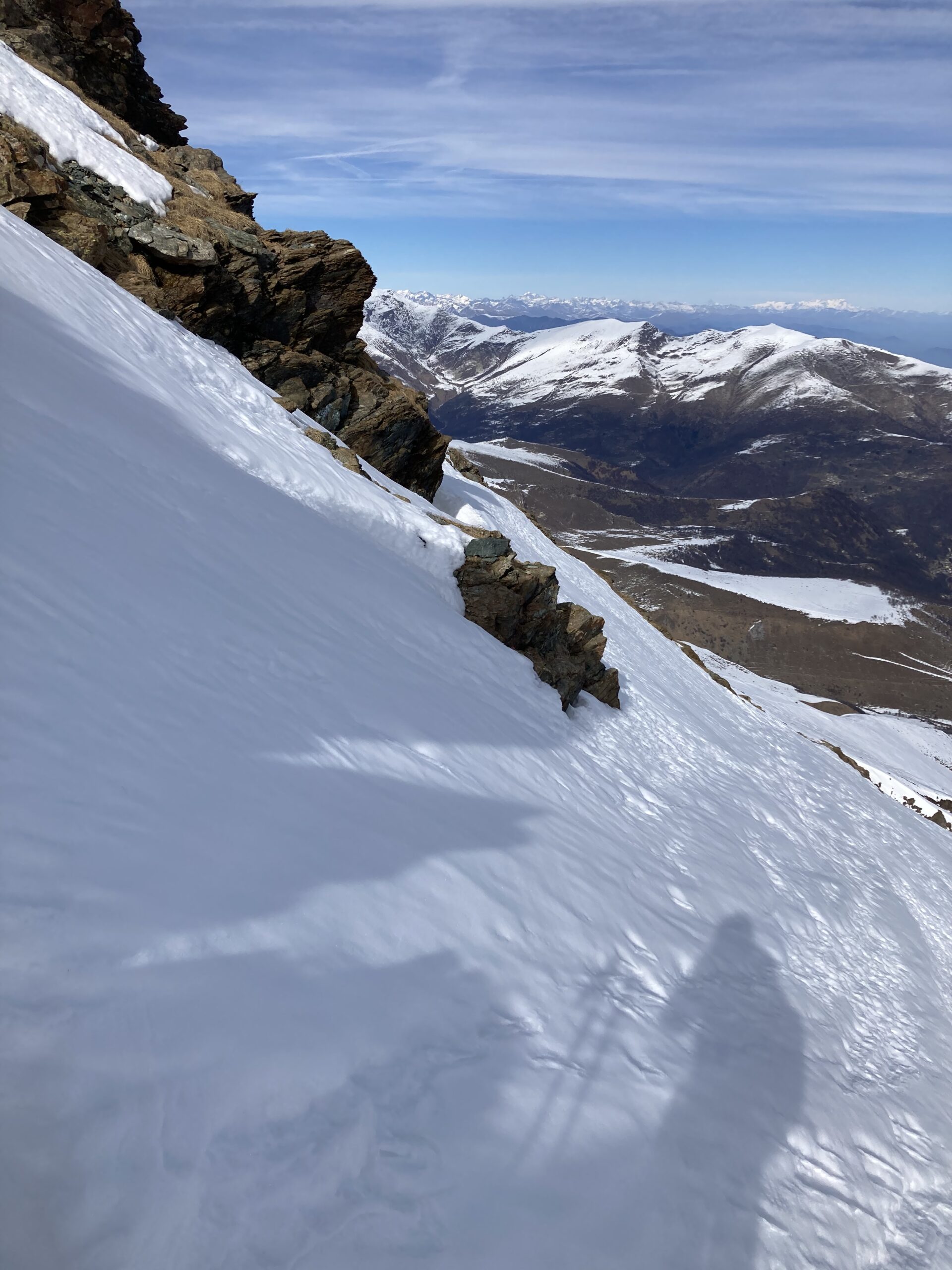 Splendida la parte alta senza nessuna traccia ; delicato e ripido l’ingresso , occorre scendere una 15 di metri dalla cima seguendo dei segni rossi poi si traversa al centro su teppe ripidissime e roccette… da lì 900 metri di cui i primi 200 più sostenuti. Molte rocce che emergono ma non si tocca nulla .