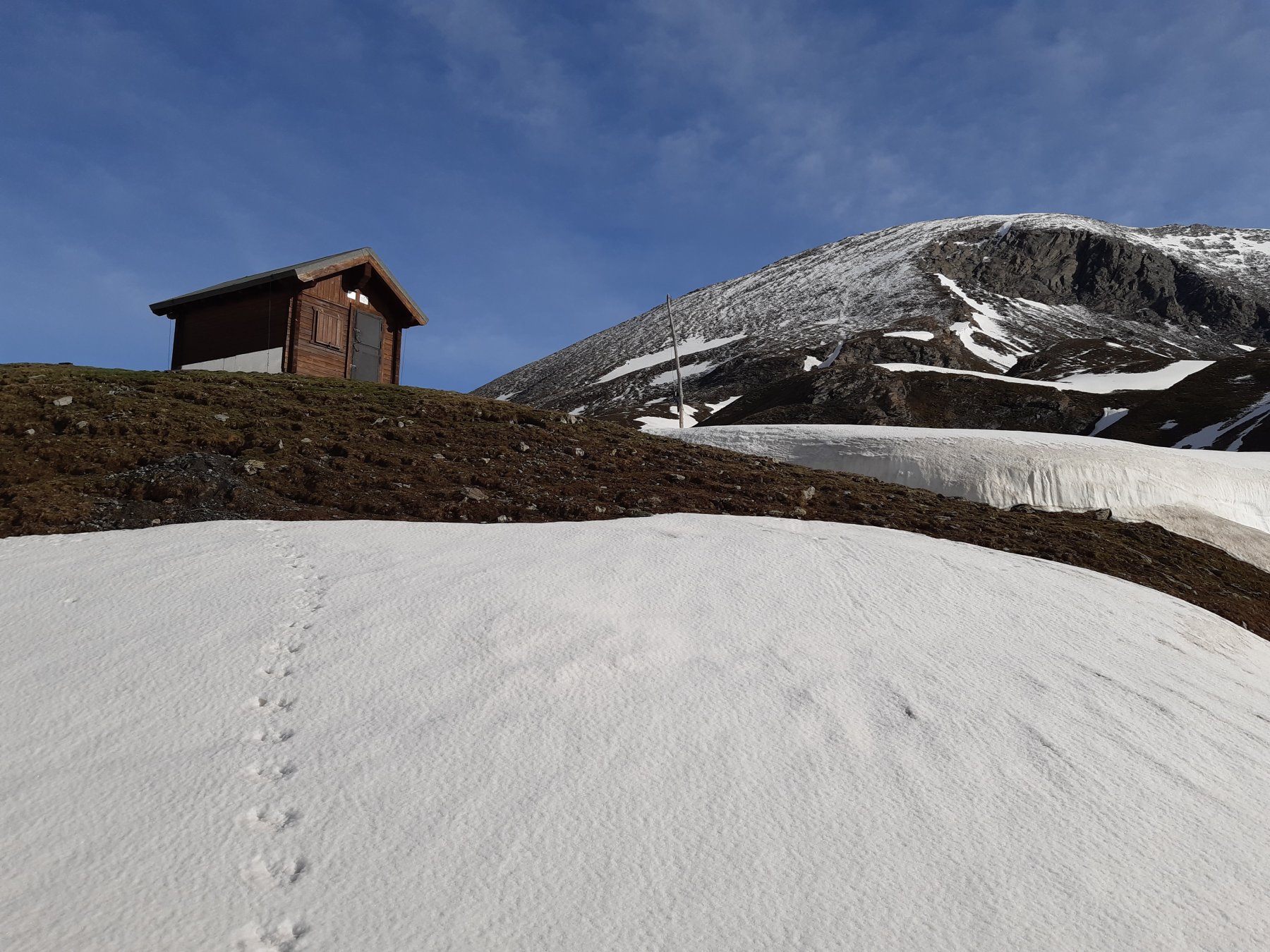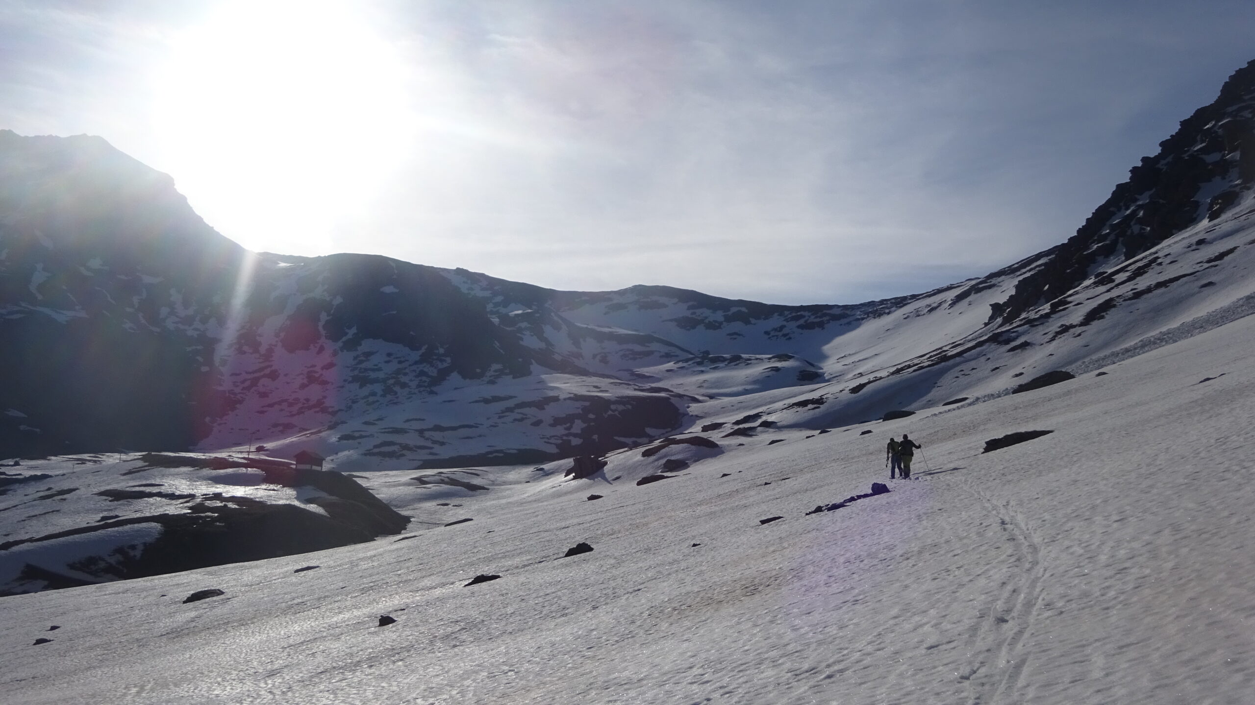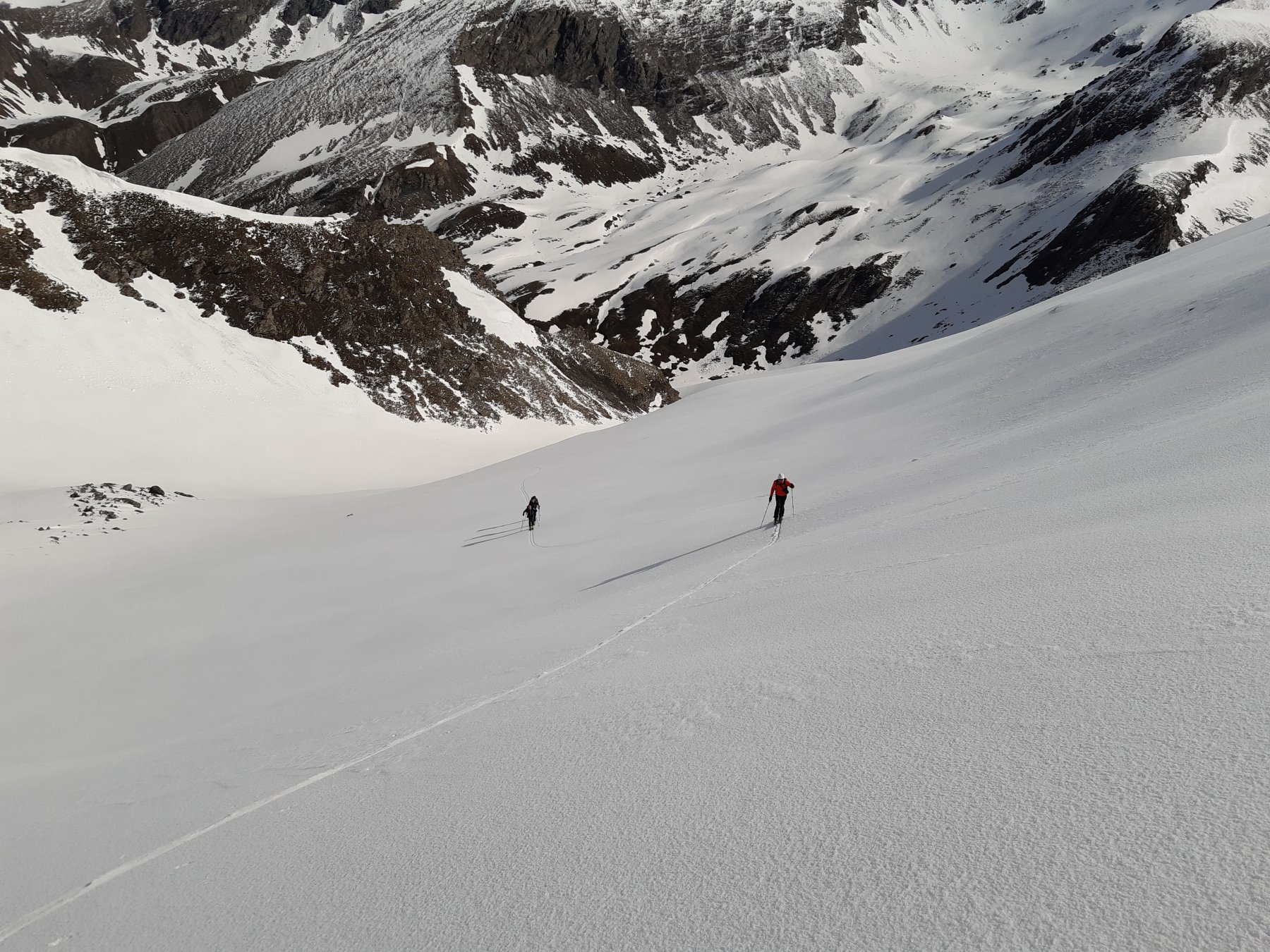 Si perviene in una bella conca dominata dalla nostra meta sulla dx. Salire i bei pendii verso sx giungendo su un ampio e lungo dosso alla base della calotta nevosa dei Rocher de Thures 2943 raggiungibile in seguito con ripellata. Seguire ora il dosso verso dx (paletto) che immette nel bel pendio finale da qui non visibile. Per esso sci ai piedi in vetta con ometto e ferro bellico piantato. Ampio panorama con la Merciantaira vicina.