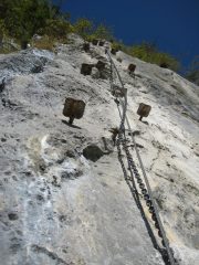 Ferrata classificata impegnativa. Ottimo stato di manutenzione. Staffe piuttosto lontane (problemi per i brevilinei). Spettacolare ma molto esposto, qualche passaggio strapiombante, un passaggio molto ostico se si porta lo zaino, spesso necessarie le braccia.