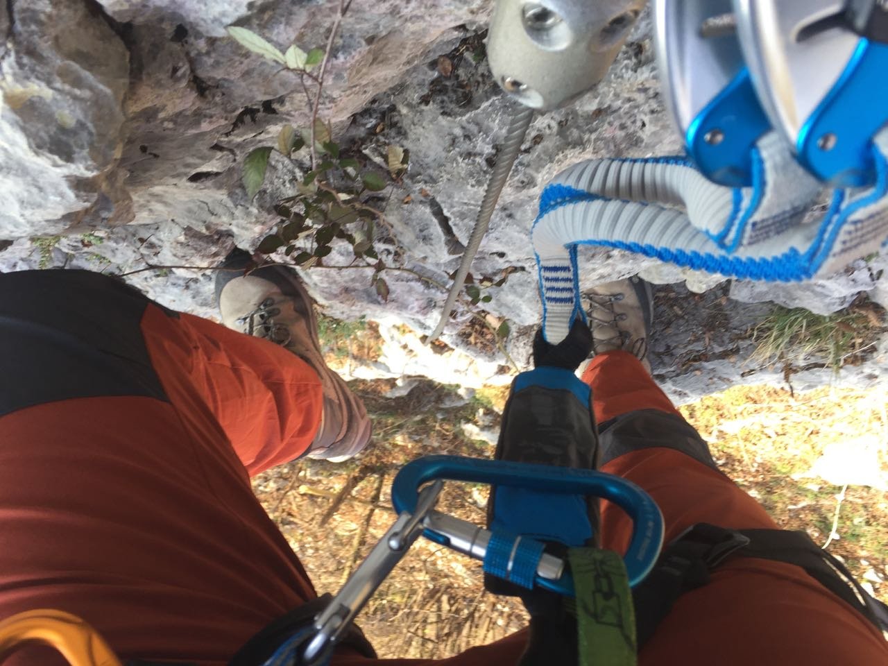 Primi 30mt impegnativi a tratti dato lo sviluppo obliquo che tende a sbilanciare con cordini e catene molto laschi e fittoni molto distanti come sistema Francese, pochi appigli naturali ed artificiali.Poi sentierino leggermente a SX porta alla parete del Corno RAT. questo secondo tratto con più appigli e staffe ma sempre impegnativo per verticalità ed esposizione. Poi con piccolo sentiero si giunge all’attacco dell’ultima parete verticale più arrampicabile ma sempre impegnativa per giungere sulla cima Corno Rat. Per il Corno Orientale si prosegue diritto per il bosco in salita per poi percorrere un costone roccioso a tratti esposto lateralmente arrivando ai piedi di un torrione ( Corno Orientale ) a tratti esposto ed impegnativo attrezzato con una catena la cui risalita è abbastanza breve, +/- 30 min. Si arriva cosi alla croce del gruppo alpinistico OSA dove si può godere di un bellissimo panorama a 280° sul Lago di Garlate, Lago di Annone e scorcio del Lago di Como.Alle spalle il Corno Centrale con il rif. SEV ai suoi piedi. Per la discesa un sentiero che porta verso Rif. SEV ed al primo crocevia si prende a SX per Acqua del Fo-San Tomaso Valmadrera come da indicazioni attraverso il bosco circa 90/120 min. fino alla macchina