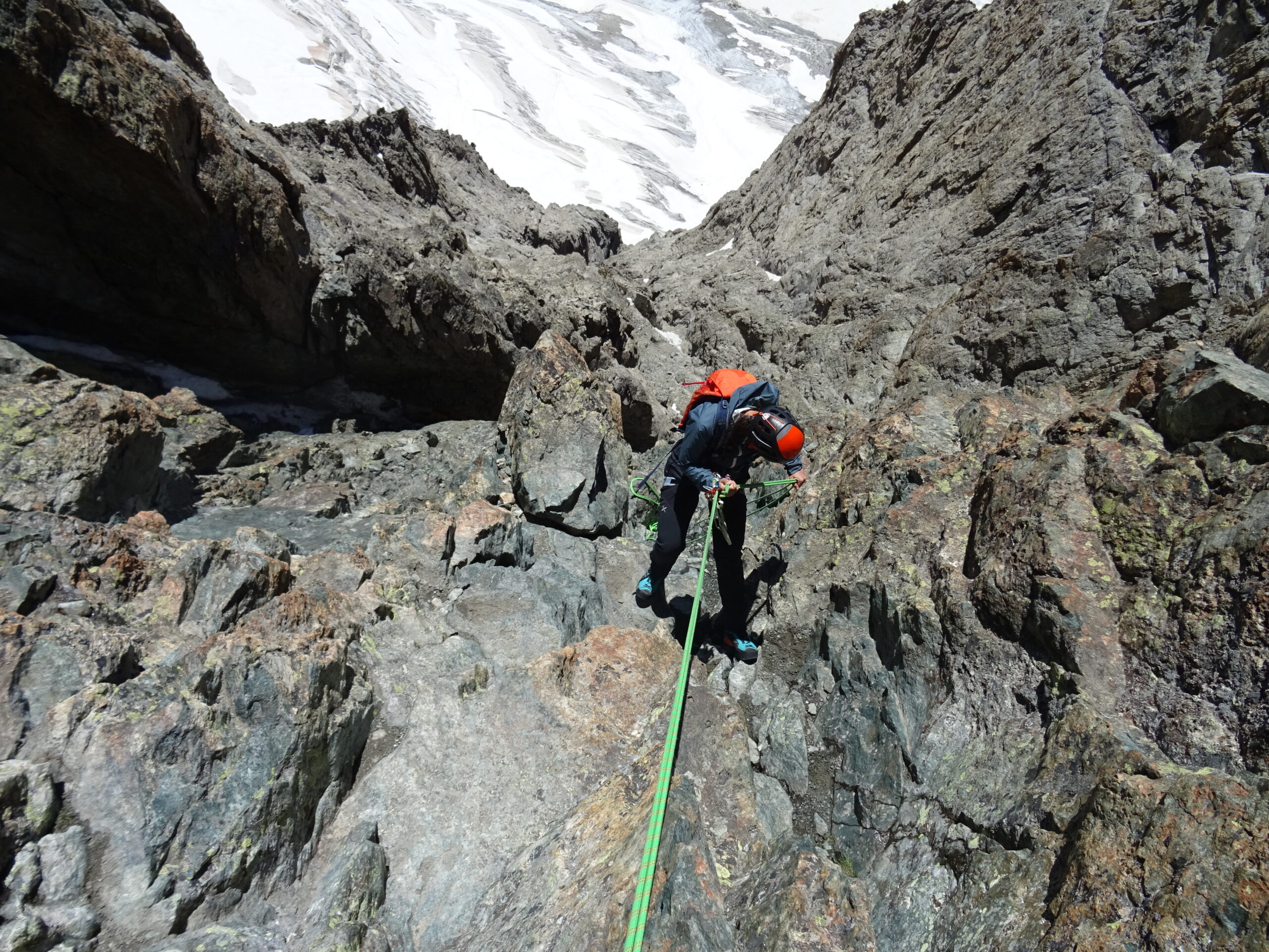 Il ghiacciaio nella parte bassa inizia a soffrire ed essere scoperto, in salita siamo passati da dx (faccia a monte) e i pochi crepi presenti si vedono molto bene e si evitano. Tratto “ripido” per raggiungere il Col de la Girose ben scalettato e facile, tutto in neve per ora. Esce un po’ di ghiaccio sulla spalla prima di attaccare la cresta, ma le pendenze sono basse e volendo si passa anche dalle roccette a lato. Noi abbiamo poi seguito il filo della cresta, evitando le noiose cenge lato sud e il relativo affollamento: sul filo solo noi, i gracchi e un granito da 5*. Qualche passaggio di III+ (un ch. sul primo salto) e poi un bel traverso stile “passo del cavallo”, oltre il quale si prosegue più facilmente fino in vetta, il tutto ben fattibile in conserva. Personalmente penso che il panorama dalla cima sia uno dei più belli che abbia mai visto, con tutto il magico massiccio d’Ecrins in bella vista. Discesa evidente per le cenge, solo un attimo di attesa alla doppia: noi ne abbiamo fatta una corta (10-15m) e poi abbiamo tagliato a sx in conserva risalendo solo qualche metro fino alla forcellina che segna la metà cresta. Materiale usato: corda da 50m (in realtà facendo questa discesa basterebbe da 30m), qualche rinvio e qualche fettuccia per i numerosi spuntoni. Discesa su neve ancora più che discreta, nella parte bassa del ghiacciaio ci siamo spostati sulla traccia di dx che in basso passa sopra qualche bel bucone.