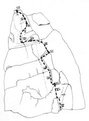 - L4: spostarsi qualche metro a sx alla base di una fessura diedro (possibilità di sostare alla base su fix), prendere la fessura che parte sopra la sosta (VI-) e al termine di questa, su rocce più facili, prendere verso destra (attenzione a molti blocchi instabili !!) e superare una placchettina (V) fino a raggiungere la sosta.