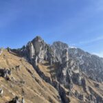 - L3: dalla sosta proseguire prendendo l’evidente diedro che sale verso sinistra, fino alla sosta su una cengia; molta erba, attenzione alle rocce mobili (III).