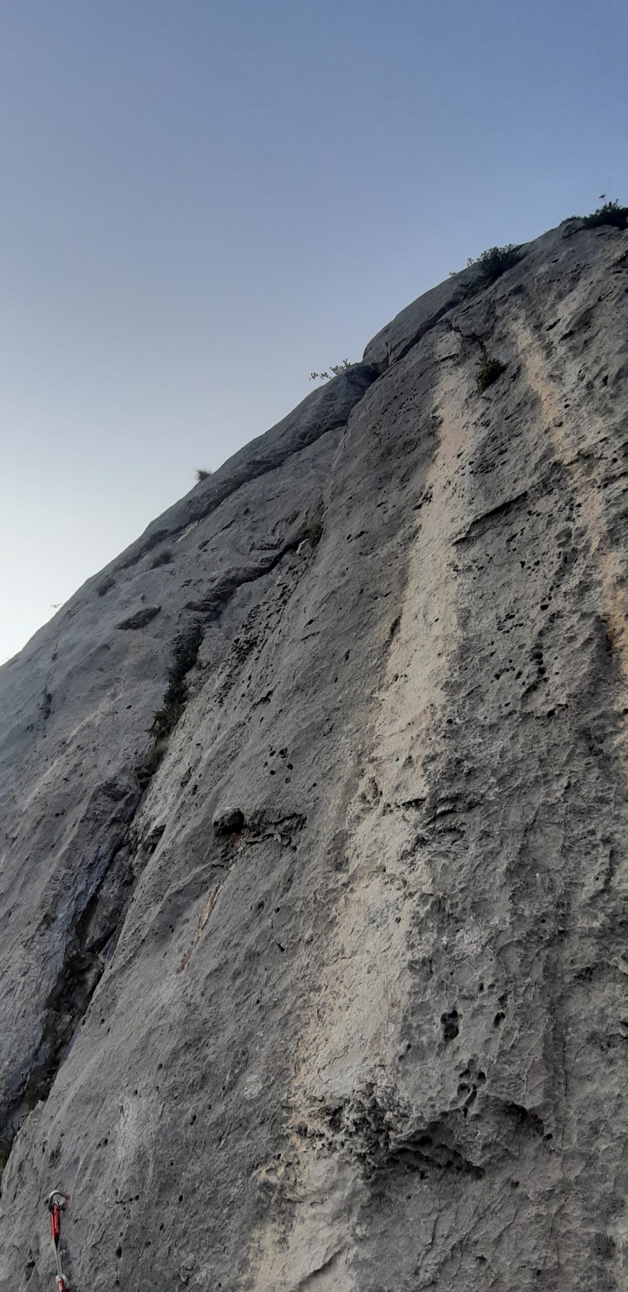 - L5: dalla sosta prendere il diedro erboso soprastante (IV), poi spostarsi leggermente verso sinistra, non prendere la sosta a spit visibile a sinistra ma continuare dritto qualche mt fino alla sosta terminale della via.