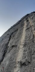 Uno dei torrioni meno frequentati della Grignetta, anche per questo l’avvicinamento è diventato una bella selva, si passa fondamentalmente tra i prati cercando la vecchia traccia spesso cancellata dal tempo. La via è impegnativa, la roccia molto medalica, anche se le difficoltà si concentrano tutte sul secondo tiro, con una menzione anche alla partenza del quarto tiro, non proprio da ridere. Rispetto a relazioni che si trovano in giro il secondo tiro è comunque abbastanza chiodato, non da A0 ma diciamo che se uno ha un 6° solido il resto si riesce a rubare, friend molto utili, chi se ne intende in libera lo da 6b. Attenzione alla roccia non solidissima sui tiri facili. Discesa con 3 doppie, l’ultima leggermente a sinistra della via su uno dei tiri della “falesia”. Via comunque meritevole e consigliata a chi di solito scala in Medale, più che a chi piace scalare sulla roccia solita della Grignetta.