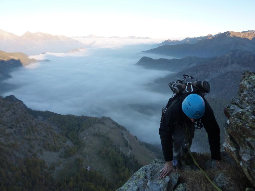 - L5 – super tiro sulla placca verticale che forma la faccia sx del diedro (5c, 50 metri).Alcuni chiodi e 2-3 di fix. Possibile sosta intermedia