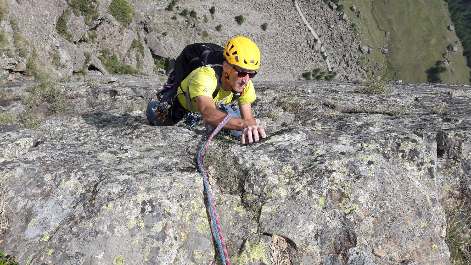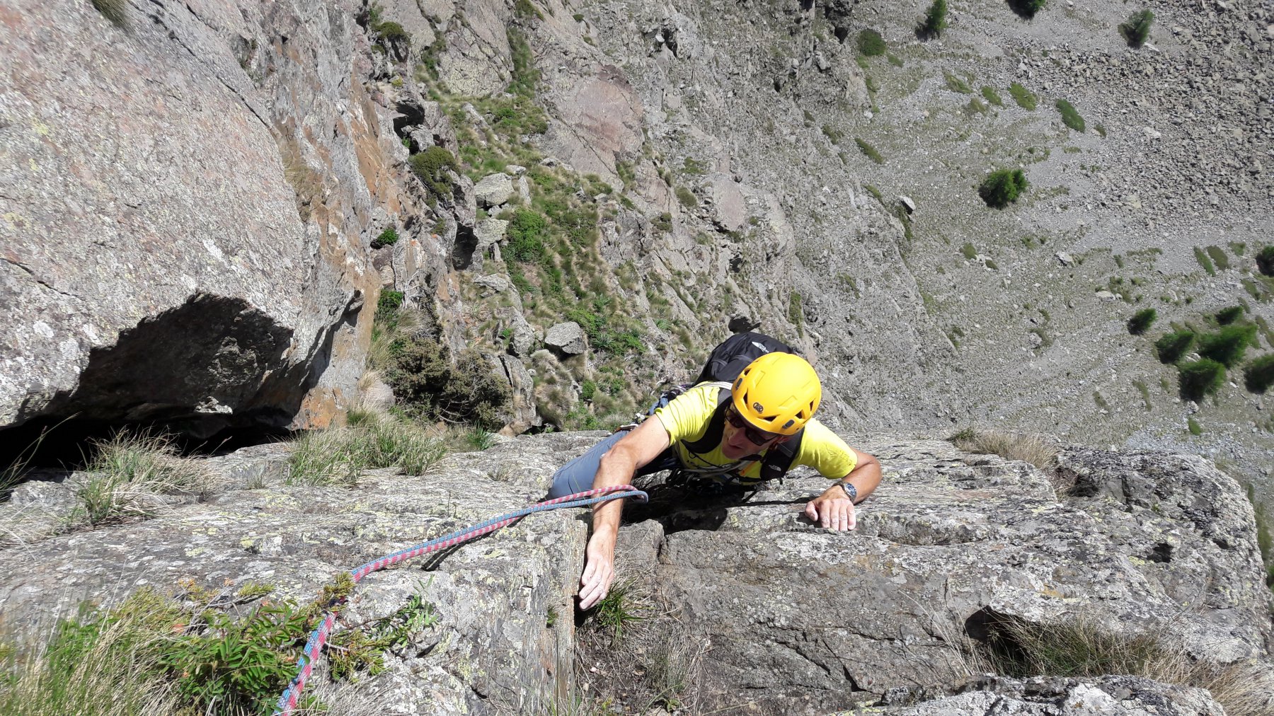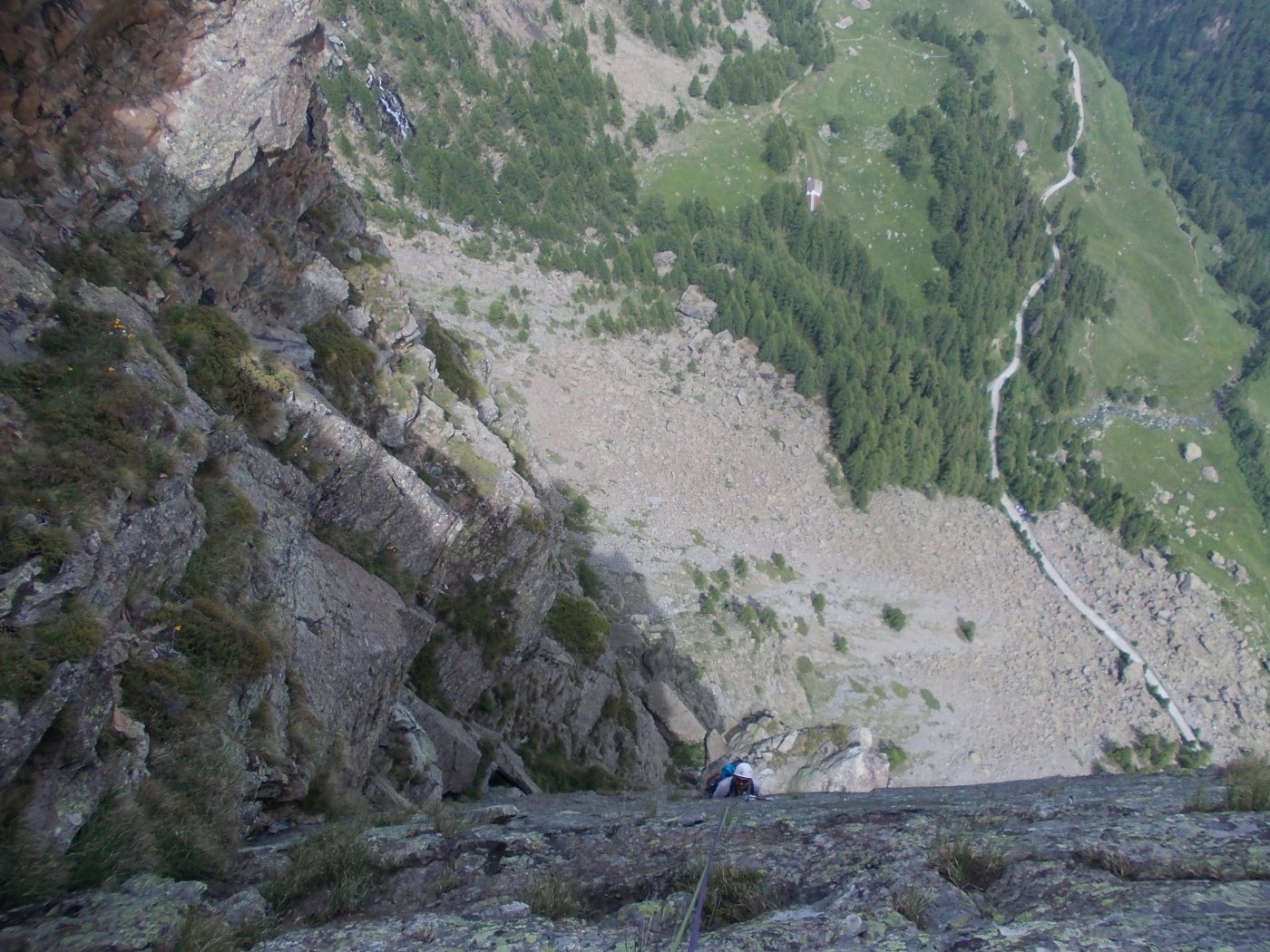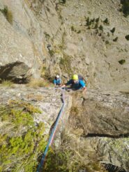 - L7 – ristabilimento (5b), poi si arrampica nel fondo del diedro fino a delle scaglie che portano a uscire dal diedro verso destra (chiodo). Si scala senza possibilità di protezione qualche metro in placca (4b) per rientrare nel diedro, qui masso incastrato, chiodo, spit sulla faccia sinistra. Si esce sulla placca a sx per una decina di metri (chiodi) per poi tornare a dx e risalire un canale erboso (5b). Dal terrazzino possibile variante decisamente a dx su spigolino aereo ( 2 chiodi visibili, sconsigliato).