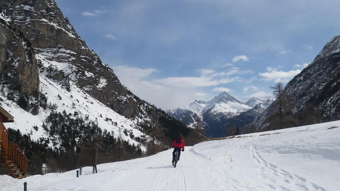 Dal parcheggio Melezet quota 1360 si fiancheggia la strada asfaltata, dove possibile, fino a raggiungere la partenza della pista da fondo che percorre la valle stretta. Dopo alcuni tornanti abbastanza impegnativi si passa sotto i paretoni dei Militi. Lungo trasferimento su falso piano e sul finire altri 4 tornanti.