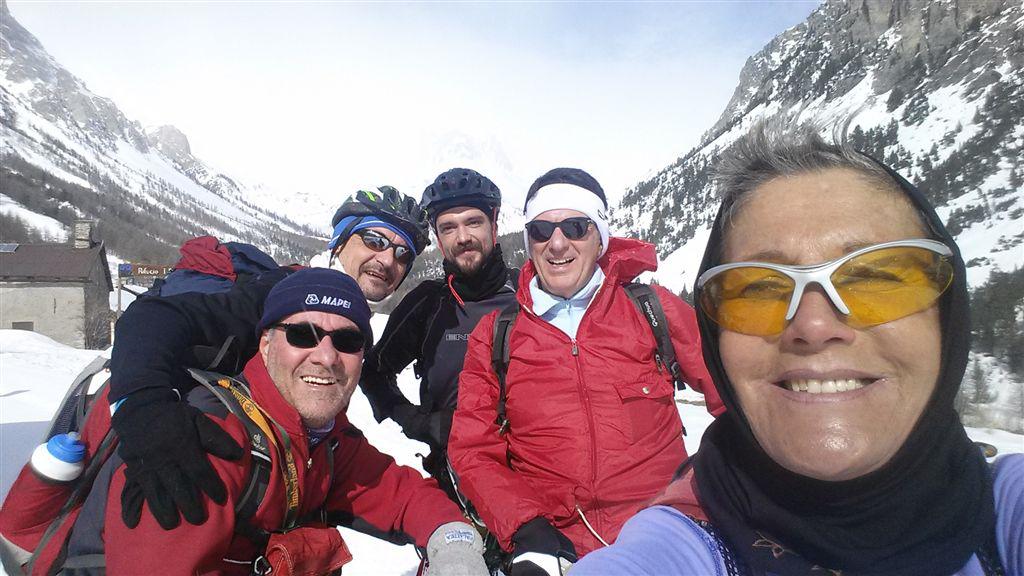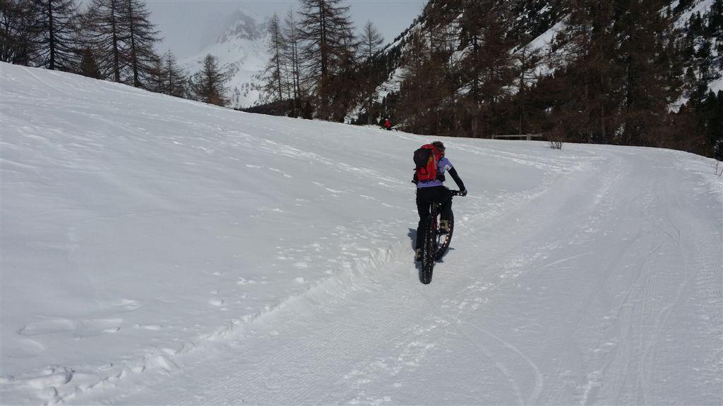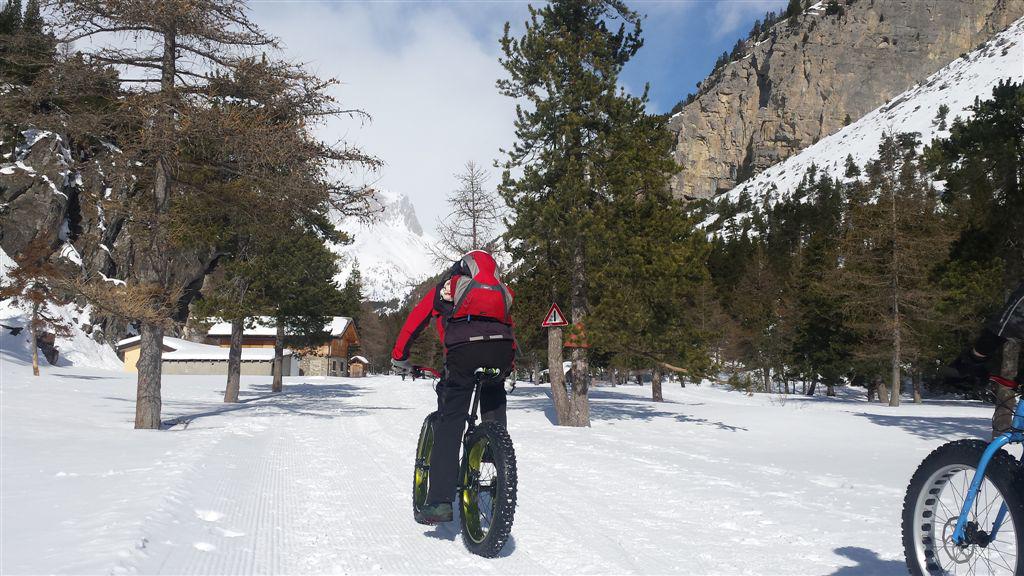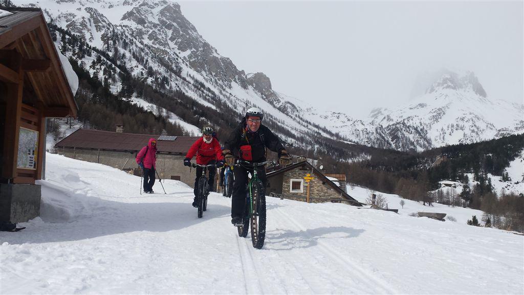 Partiti da Melezet in direzione Valle Stretta e risaliti fino al rifugio “Re Magi”su strada battuta dai gatti. In salita si fatica molto di più che con le MTB sia per il peso della bici, ca. 17 kg, che per le condizioni del terreno. In discesa gran divertimento e tenuta stupefacente anche grazie alle gomme da 5” che danno una sicurezza sorprendente sulla neve. Bella esperienza da riprovare su percorsi un po’ più intriganti.