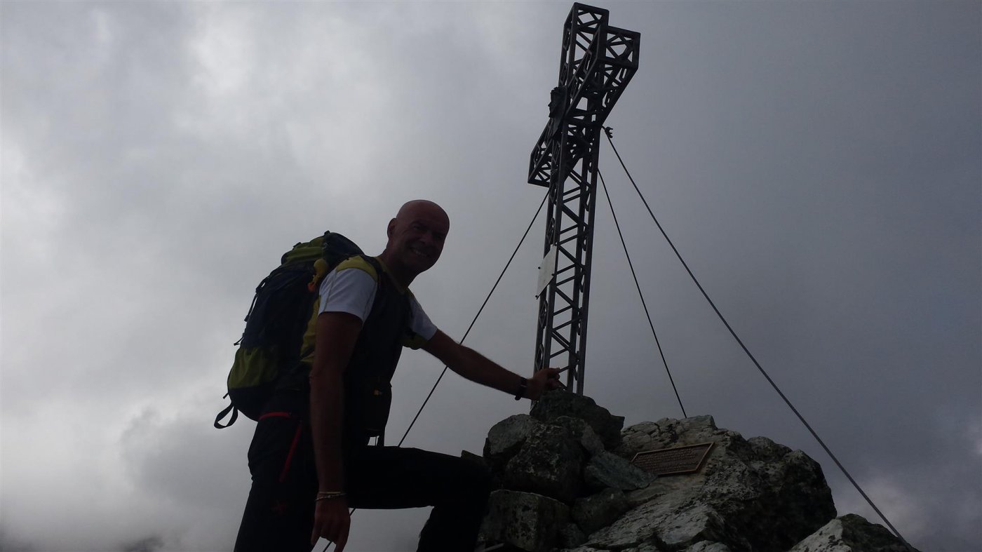 Passi di II° tra cengette, muretti ed alcune pietre vaganti. Si arriva ad un diedro su cui si trovano 2 frecce convergenti: praticamente si può proseguire a dx e sx. Noi siamo saliti alla dx del diedro ed in breve alla croce. Discesa sulla via di salita.