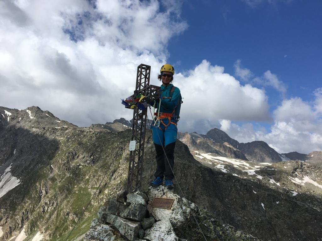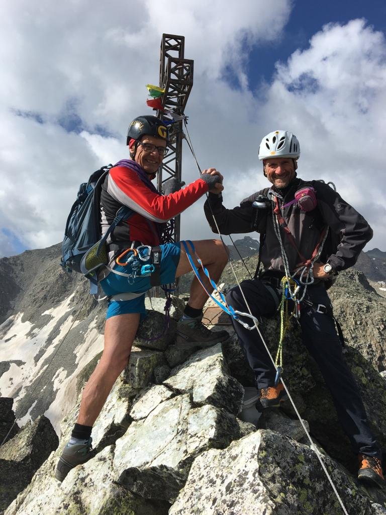 Saliti per la diretta perché non visto il traverso a sinistra della normale. Nuvolaglia in cima che ha compromesso in parte il panorama. Scesi dalla stessa via un una doppia da 25 ed una da 15, disarrampicando il resto. Lasciato una maglia rapida sul cordone accoppiato al cavetto di acciaio in cresta.