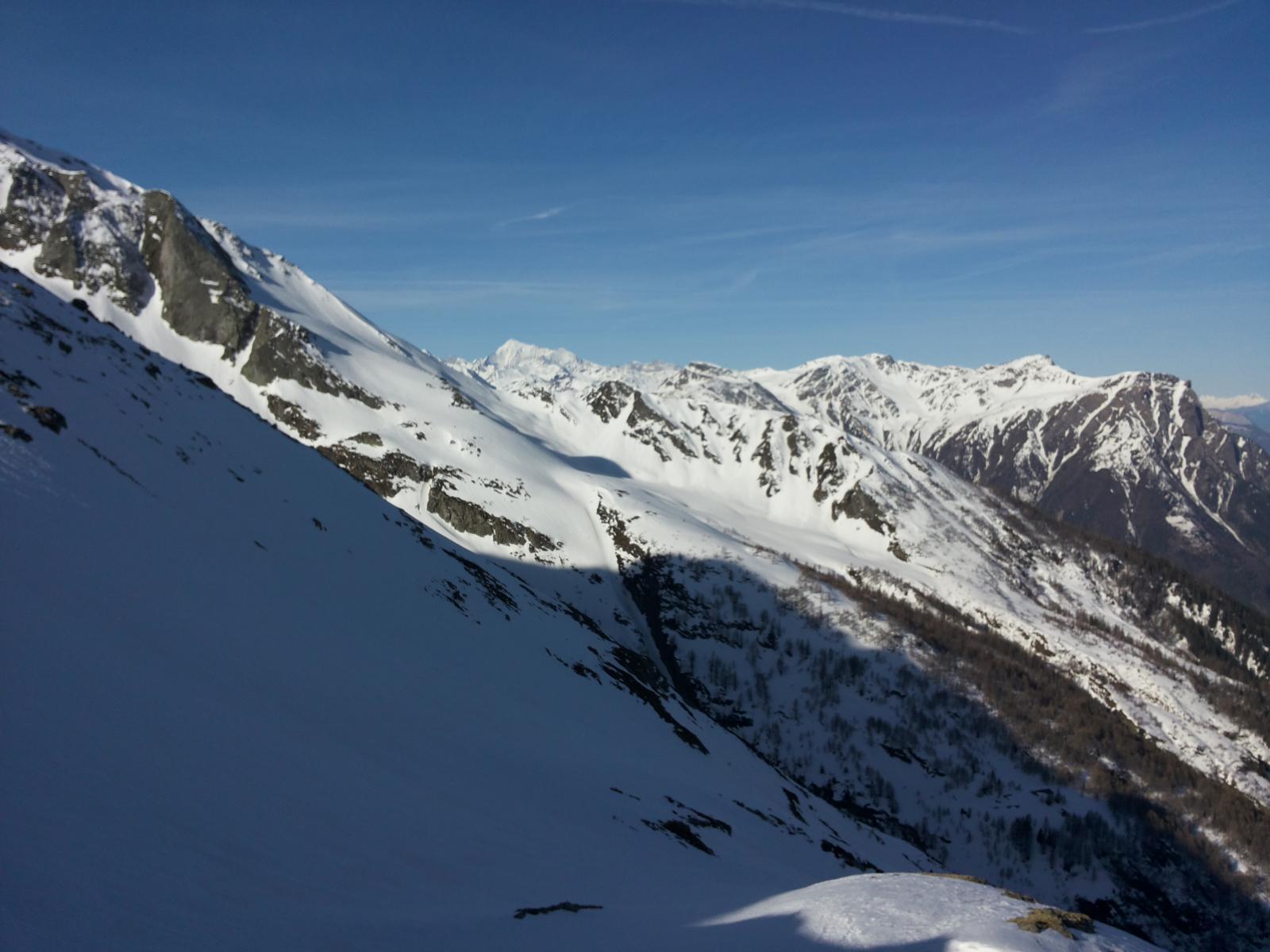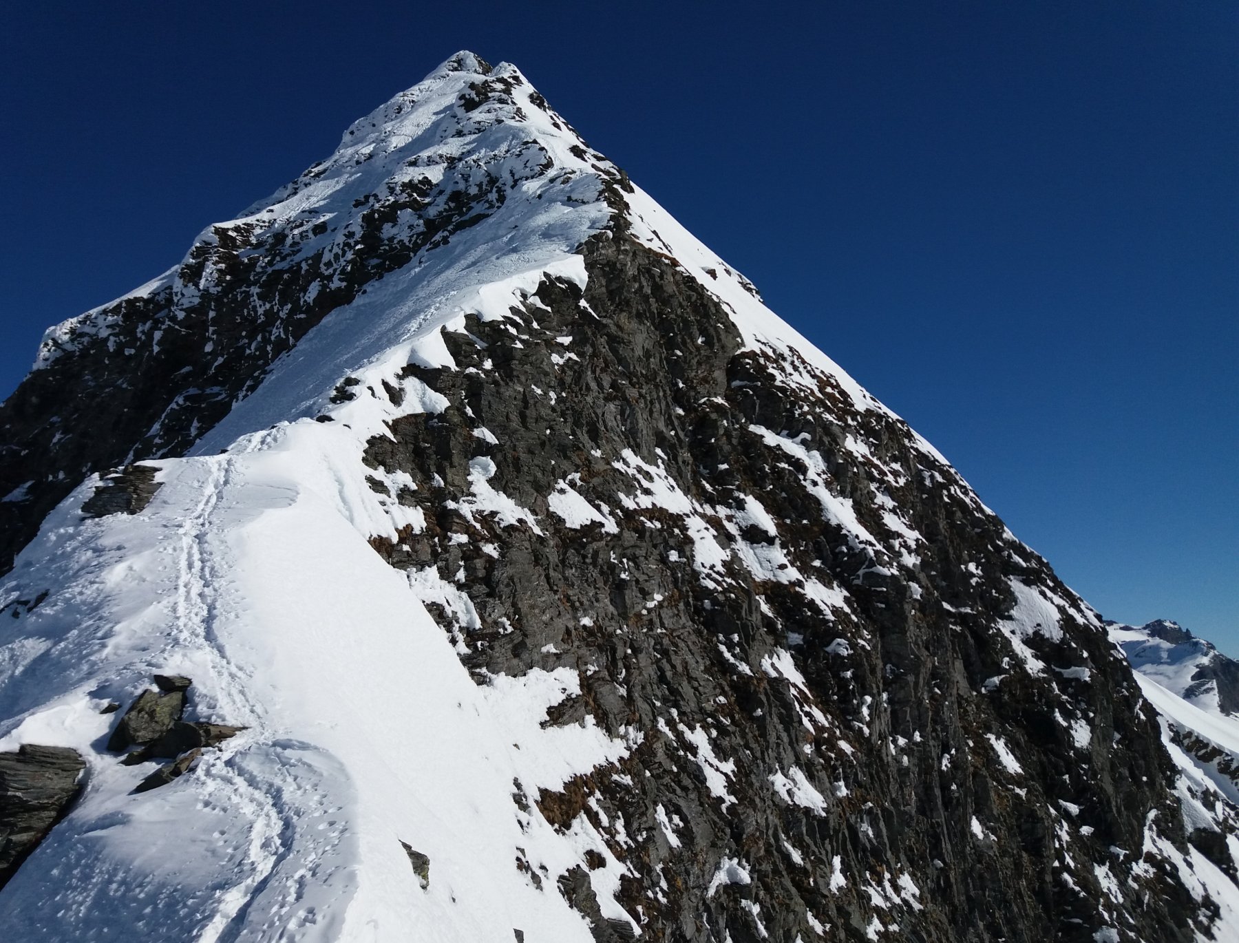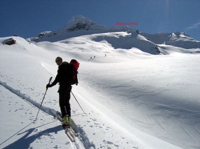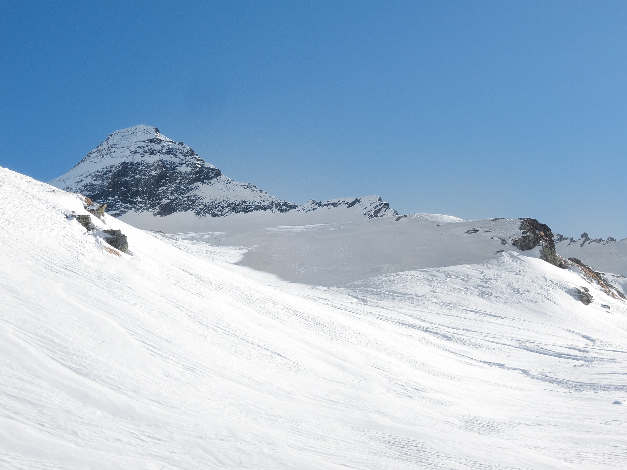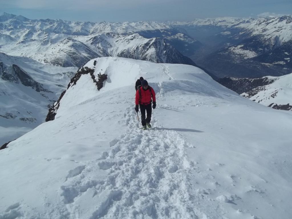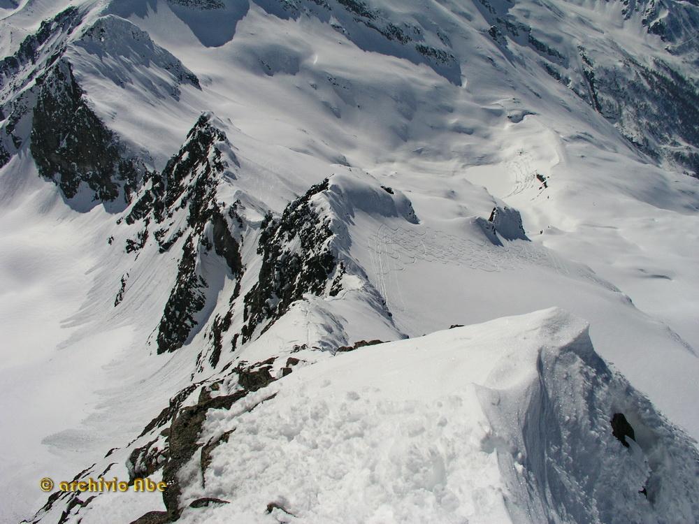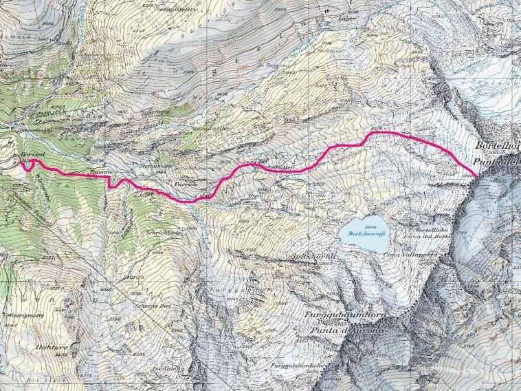 Dal tornante in località Berisal lungo la strada che dal Passo del Sempione scende a Briga si sale seguendo prima una strada carrabile e poi per il sentiero estivo fino a Bortel ( q. 2.113 Bortel Hutte); da lì per pendii aperti si tocca il Bortelgletscher e piegando decisamente a destra si giunge al coletto q. 2.986 della cresta SO. L’itinerario con gli sci termina qui. La cresta, lunga e a tratti esposta, a seconda delle condizioni può risultare più o meno impegnativa (PD, spit, breve corda fissa a 2/3 circa). Discesa lungo l’itinerario di salita o più diretta verso la punta d’aurona da cui si può tenere la sx orografica sino al torrente ove termina la stradina. La parte alta dell’itinerario è ben visibile dalla partenza.