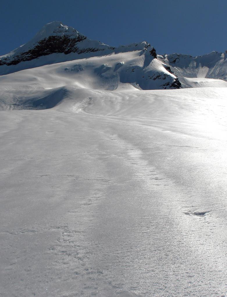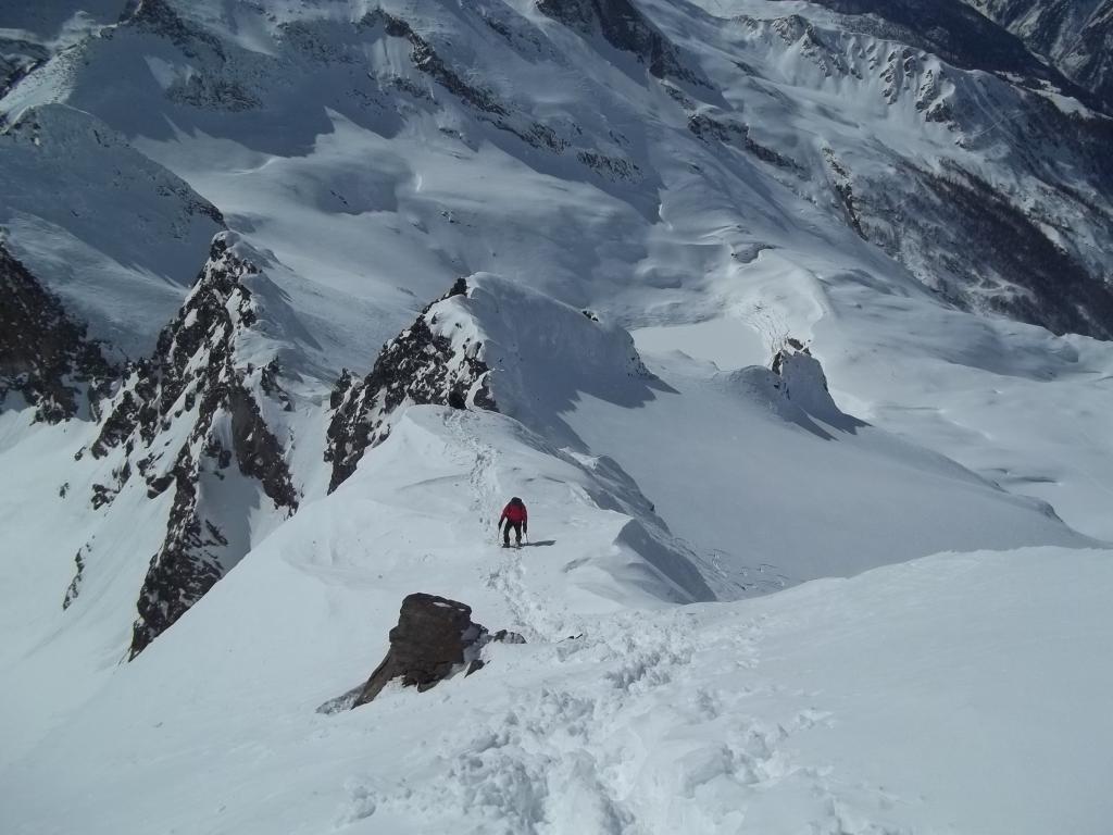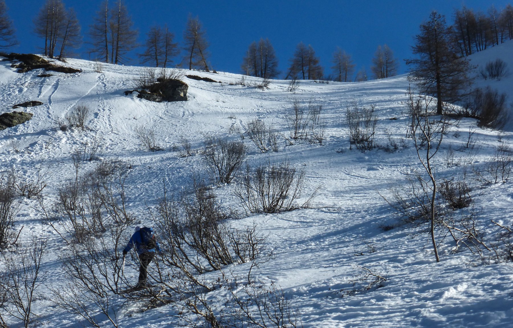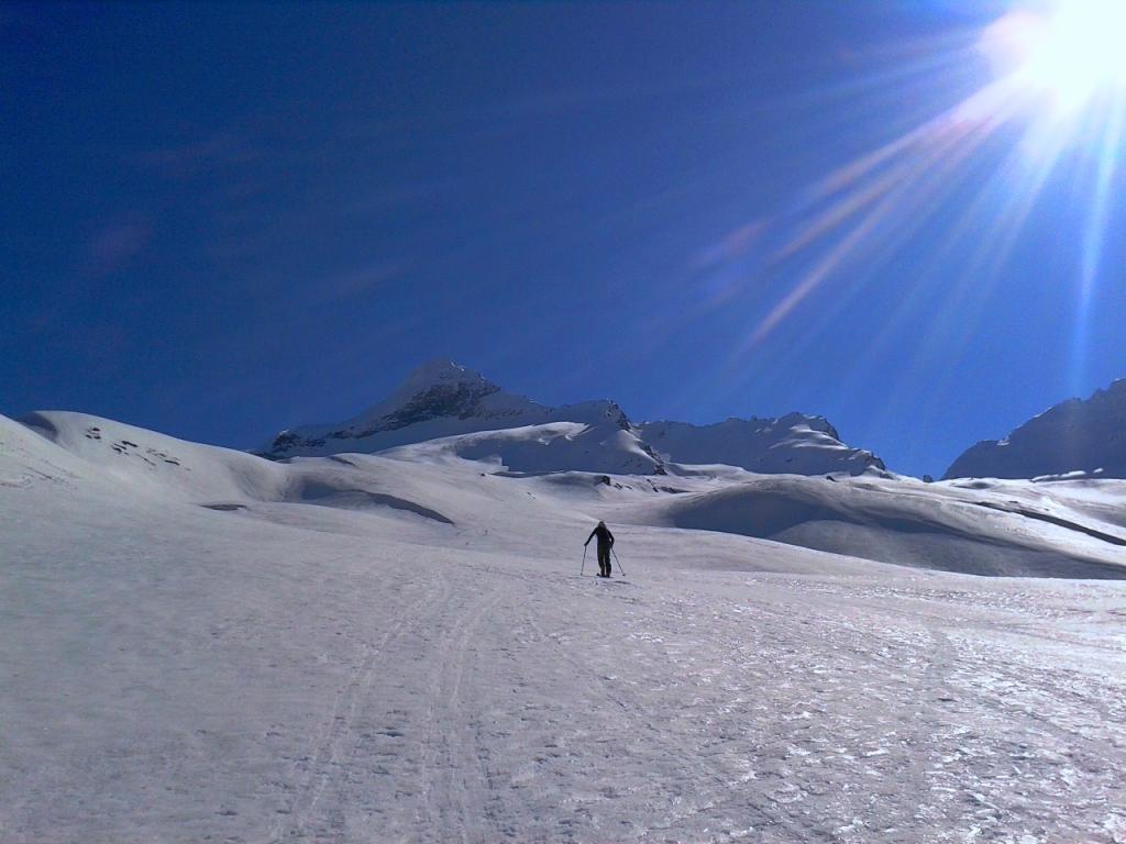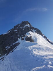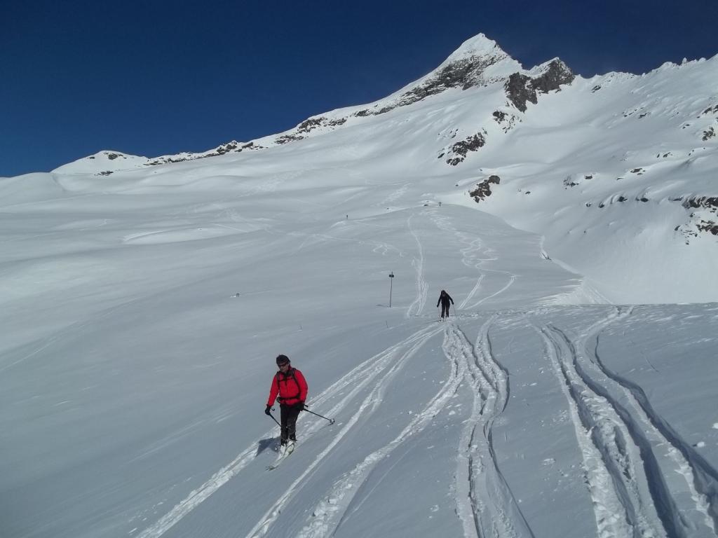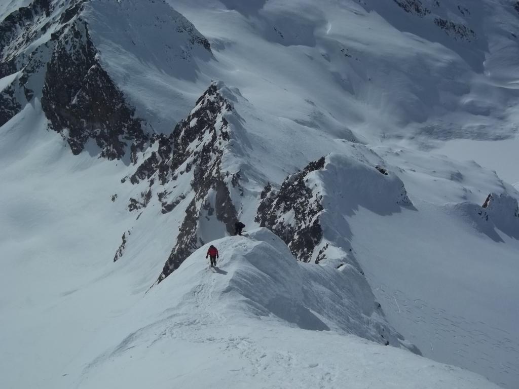 Dal tornante in località Berisal lungo la strada che dal Passo del Sempione scende a Briga si sale seguendo prima una strada carrabile e poi per il sentiero estivo fino a Bortel ( q. 2.113 Bortel Hutte); da lì per pendii aperti si tocca il Bortelgletscher e piegando decisamente a destra si giunge al coletto q. 2.986 della cresta SO. L’itinerario con gli sci termina qui. La cresta, lunga e a tratti esposta, a seconda delle condizioni può risultare più o meno impegnativa (PD, spit, breve corda fissa a 2/3 circa). Discesa lungo l’itinerario di salita o più diretta verso la punta d’aurona da cui si può tenere la sx orografica sino al torrente ove termina la stradina. La parte alta dell’itinerario è ben visibile dalla partenza.