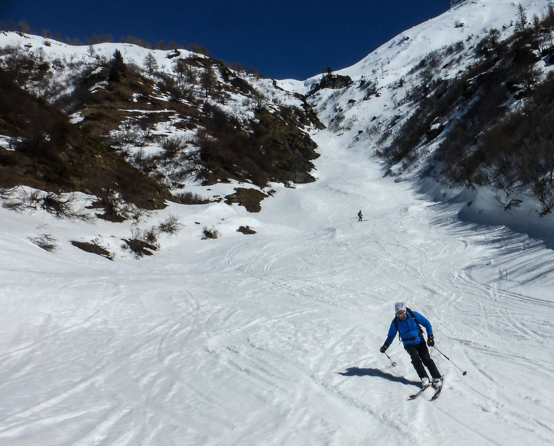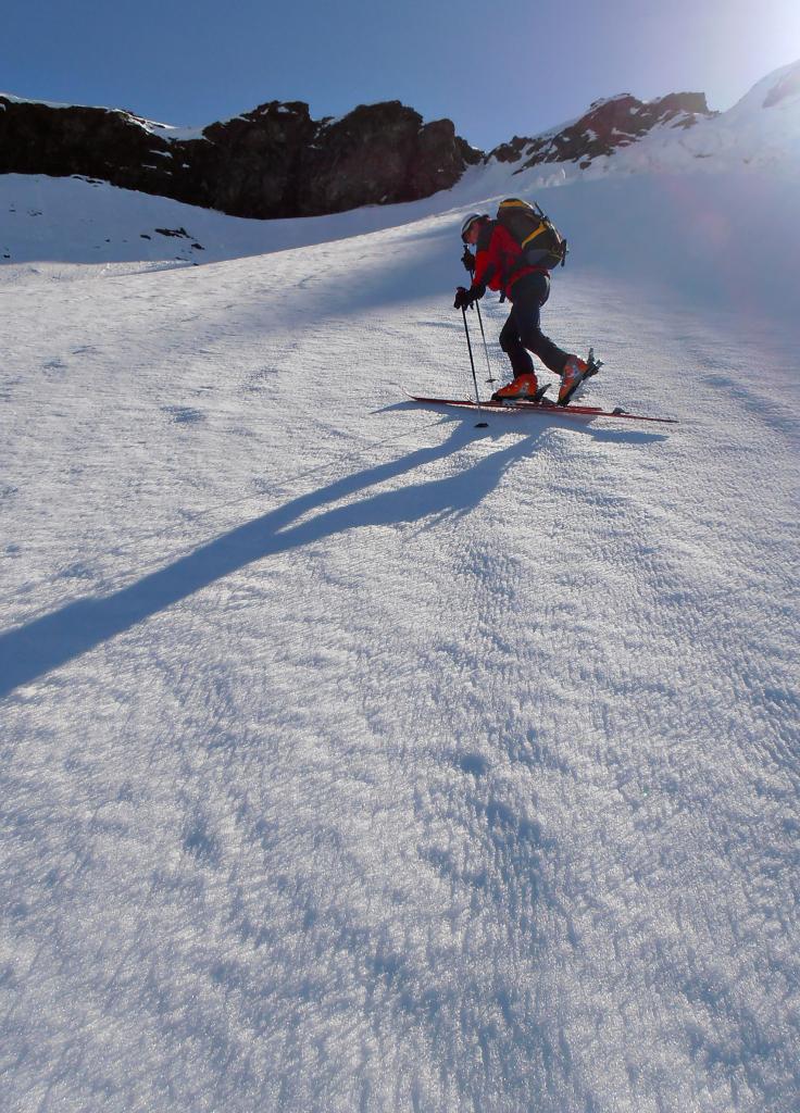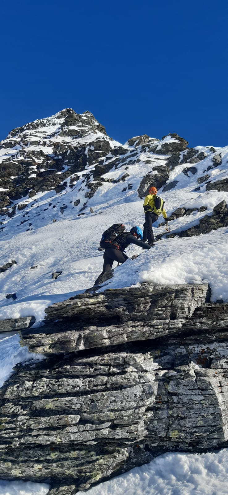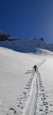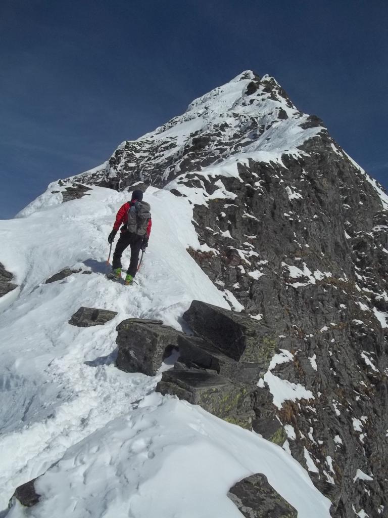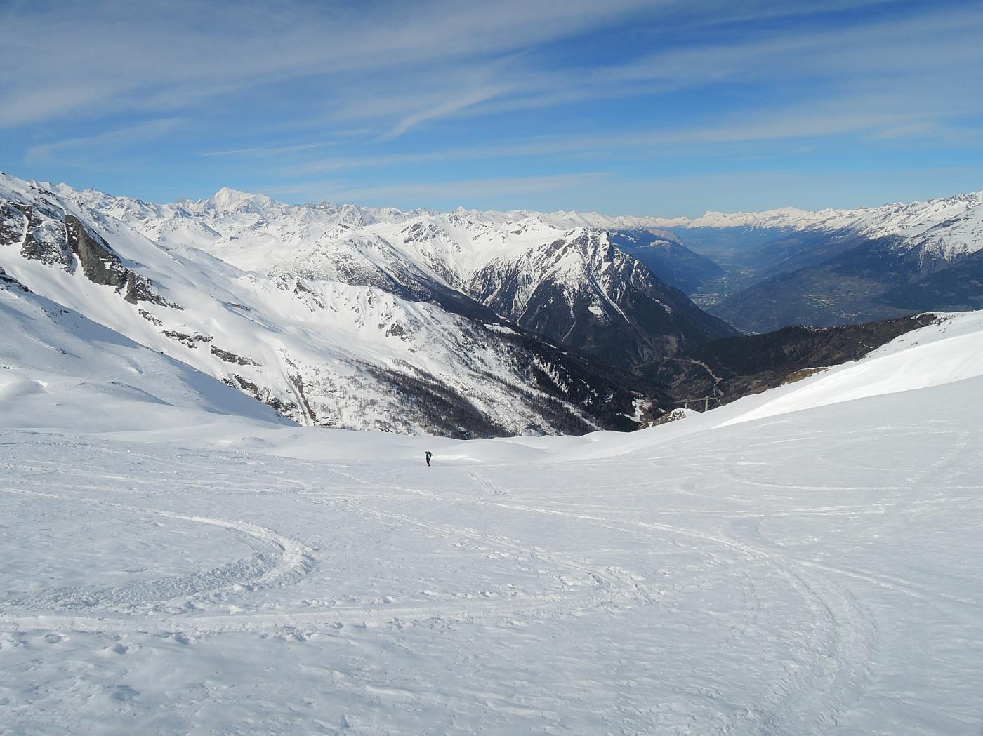 Dal tornante in località Berisal lungo la strada che dal Passo del Sempione scende a Briga si sale seguendo prima una strada carrabile e poi per il sentiero estivo fino a Bortel ( q. 2.113 Bortel Hutte); da lì per pendii aperti si tocca il Bortelgletscher e piegando decisamente a destra si giunge al coletto q. 2.986 della cresta SO. L’itinerario con gli sci termina qui. La cresta, lunga e a tratti esposta, a seconda delle condizioni può risultare più o meno impegnativa (PD, spit, breve corda fissa a 2/3 circa). Discesa lungo l’itinerario di salita o più diretta verso la punta d’aurona da cui si può tenere la sx orografica sino al torrente ove termina la stradina. La parte alta dell’itinerario è ben visibile dalla partenza.