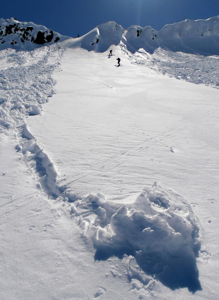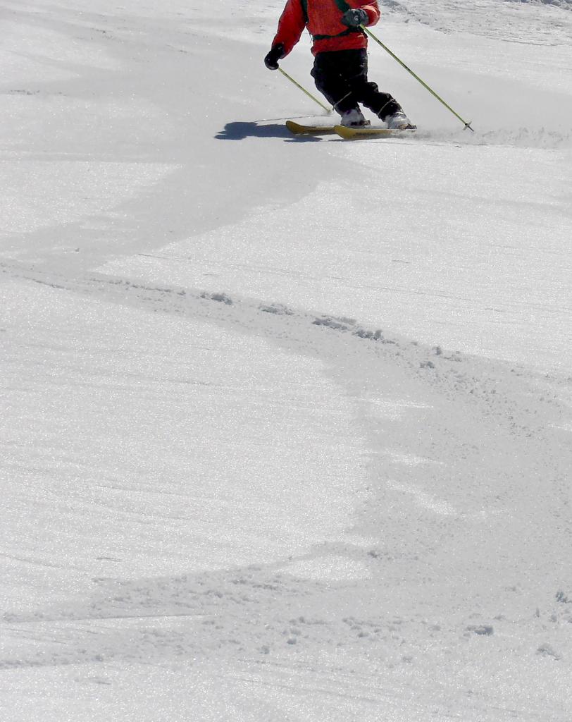 Si calzano gli sci a 500 mt. dalle macchine e sulla strada si incontra qualche piccolo tratto senza neve ed una enorme valanga,coltelli obbligatori per superare la prima ripida bastionata,noi abbiamo percorso il lato sx orografico in quanto il sentiero estivo obbligava a portare sci a spalla per molto tempo.Pendii alti senza problemi,molta neve per accesso al colle (no ramponi) dove ci siamo fermati, altri gruppi hanno proseguito per la vetta.In discesa ore 12.30 trasformata perfetta, leggermente dura sui pendii alti,ma proseguendo si trovano condizioni superlative,ci siamo spostati verso SW sfiorando il lago per poi prendere i pendii direzione W con trasformata “cotta a puntino” infine sulla strada si trova neve molto bagnata