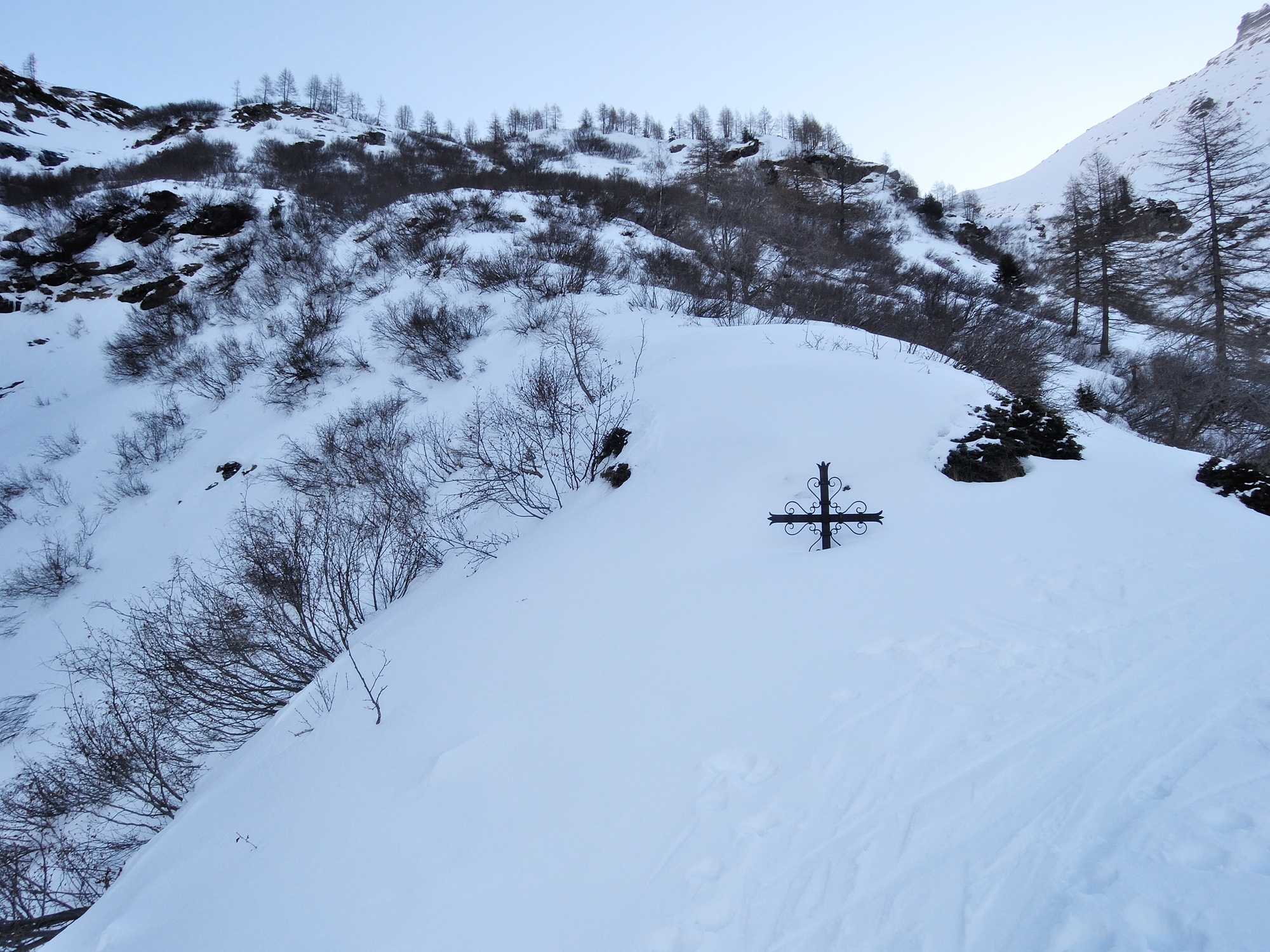 Partiti con l’idea di limitarci alla parte sciistica, troviamo all’inizio neve polverosa, che non sembra avere subito gli effetti del forte vento di inizio settimana. Passato il Ganterbach cominciamo a salire i ripidi pendii, innevati ma invasi da una boscaglia di ontanelli, con frequenti traversi su neve indurita al limite della percorribilità senza rampanti. Arriviamo quindi alle baite di Bortelalp dove ci appare la parte alta del percorso; qui il vento si è fatto decisamente sentire e la neve si presenta ovunque rimaneggiata, con un sottile strato di polvere riportato su fondo quasi sempre portante e varie placche lucide piuttosto scivolose. Non si notano comunque accumuli pericolosi, visto il ridotto spessore della neve. L’ultimo lungo traverso che conduce al colletto 2986 è reso faticoso dalla consistenza della neve, con lo strato polveroso ora più spesso ma non vincolato al fondo, per cui ad ogni passo si scivola decisamente. In più, le leggere ed incostanti brezze si trasformano in un vento quasi continuo e piuttosto fastidioso. Arrivati al deposito degli sci decidiamo di rinunciare a salire i pochi metri fino al colletto, problematici senza ramponi. Ci prepariamo così per la discesa; le prime curve sono molto divertenti sulla ripida parte superiore del Bortelgletscher con polvere riportata, poi la consistenza della neve si dimostra leggermente peggio di quanto speravamo salendo: la crosta da vento a volte cede e la polvere indurita alternata a placche scivolose richiederebbe un paio di gambe ben più allenate delle mie (oltre che più giovani), Il vento ci accompagna anche durante la breve pausa alimentare alla Bortelalp; la situazione migliora nella successiva discesa verso il guado, dove la neve portante rende meno difficile lo slalom tra gli ontanelli. Poco a valle della Bortelalp occorre fare attenzione ad un invitante canale che porta sopra una cascata di ghiaccio vivo. Riattraversato il torrente ritroviamo la neve polverosa della mattina, che rende divertente il rientro lungo il sentiero, con qualche breve passaggio su terreno più aperto, e lungo la strada dove in un paio di punti bisogna spingere un po’.