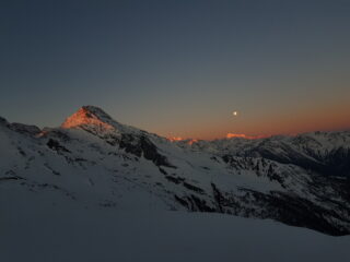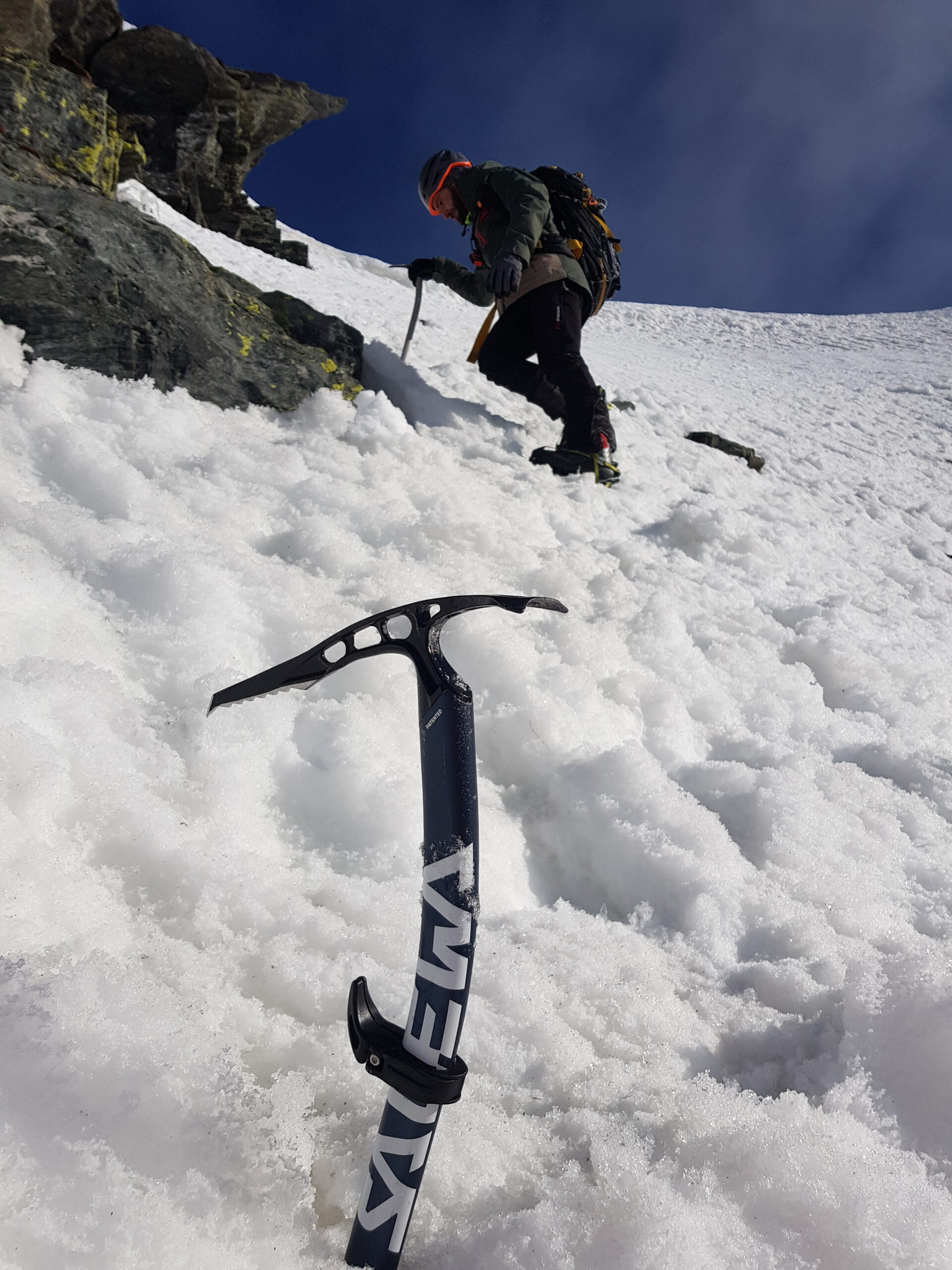 Partenza h4.00 dal tornante di Berisal (bisognava tornare in baita per la grigliata di pasquetta😁😁). Non intuitivo il guado del fiume per prendere il sentiero che porta alla Bortelhutte, complice anche il fatto che fosse notte…il che ha generato un ravanage da manuale con sci in spalla tra gli ontanelli. In ogni caso salendo passare dalla sponda destra a quella sinistra prima che il fiume si divida in due valli separate(evidente dalla traccia Gpx che ho caricato).A piedi fino alla capanna, da lì su misere rimanenze di neve sci ai piedi fino a 2400m dove l’innevamento diventa dignitoso. Fino al deposito sci comodamente senza coltelli su fondo duro, cresta con poca neve ma comunque senza difficoltà, non abbiamo trovato ne corde fisse ne spit, probabilmente perche abbiamo deciso di passare l’ultimo salto di roccia aggirandolo alla destra facendo un traverso che ci ha portato ad un’ultima salita di neve di 25m che porta alla sommità tra la croce e la vetta effettiva.