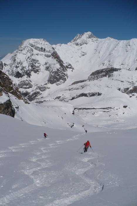 Discesa sullo stesso versante. In condizioni di innevamento ottimali è possibile scendere alcuni canali a sud-ovest (intorno ai 40°), che danno direttamente sul Glacier Ferrari. Dal Glacier de la Réchasse si può evitare di pasare dal colle de la Vanoise e dal Rifugio, per ampi valloni a tratti anche ripidi (intorno a 35°) esposti a nord che danno sul vallone del Cirque d’Arcellin
