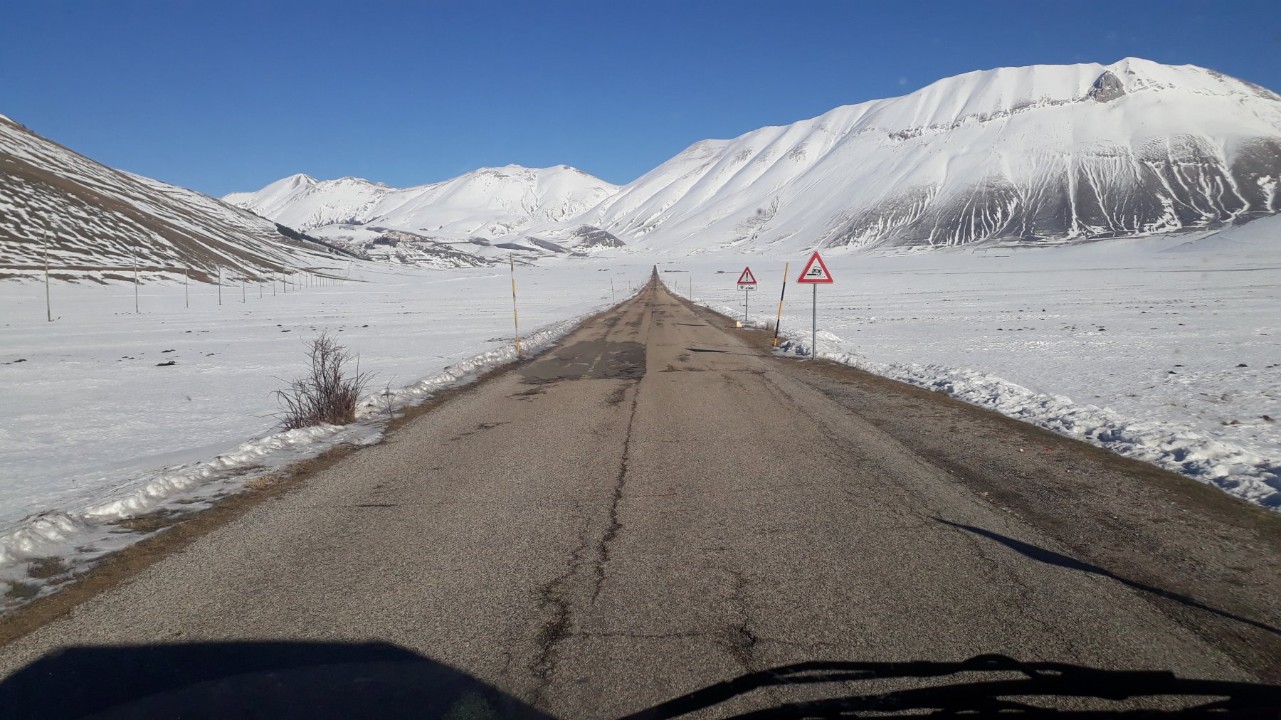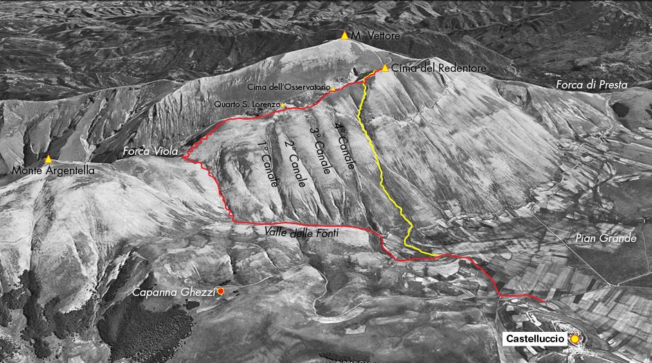 da Castelluccio si segue la strada verso la valle delle Cento Fonti. si arriva alla base dell’evidente canale che porta in vetta (ramponi utili).
