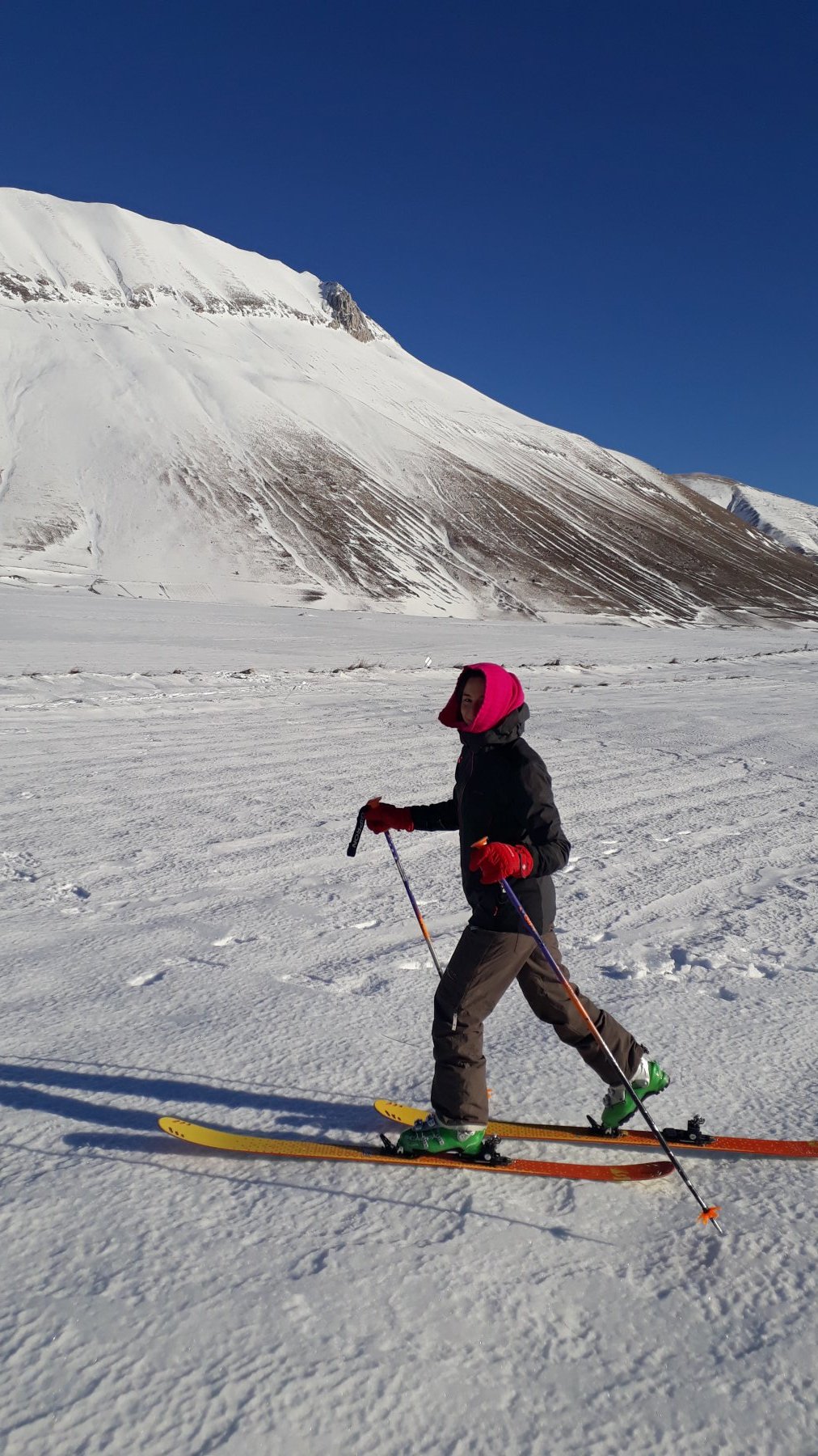 Gita a Castelluccio con Elisa. Salita per la Valle delle Fonti fino al colletto (1800 s.l.m. circa) e discesa sui pendii ampi esposti a Sud con vista su Castelluccio. Neve a tratti simpatica. Meglio di niente.