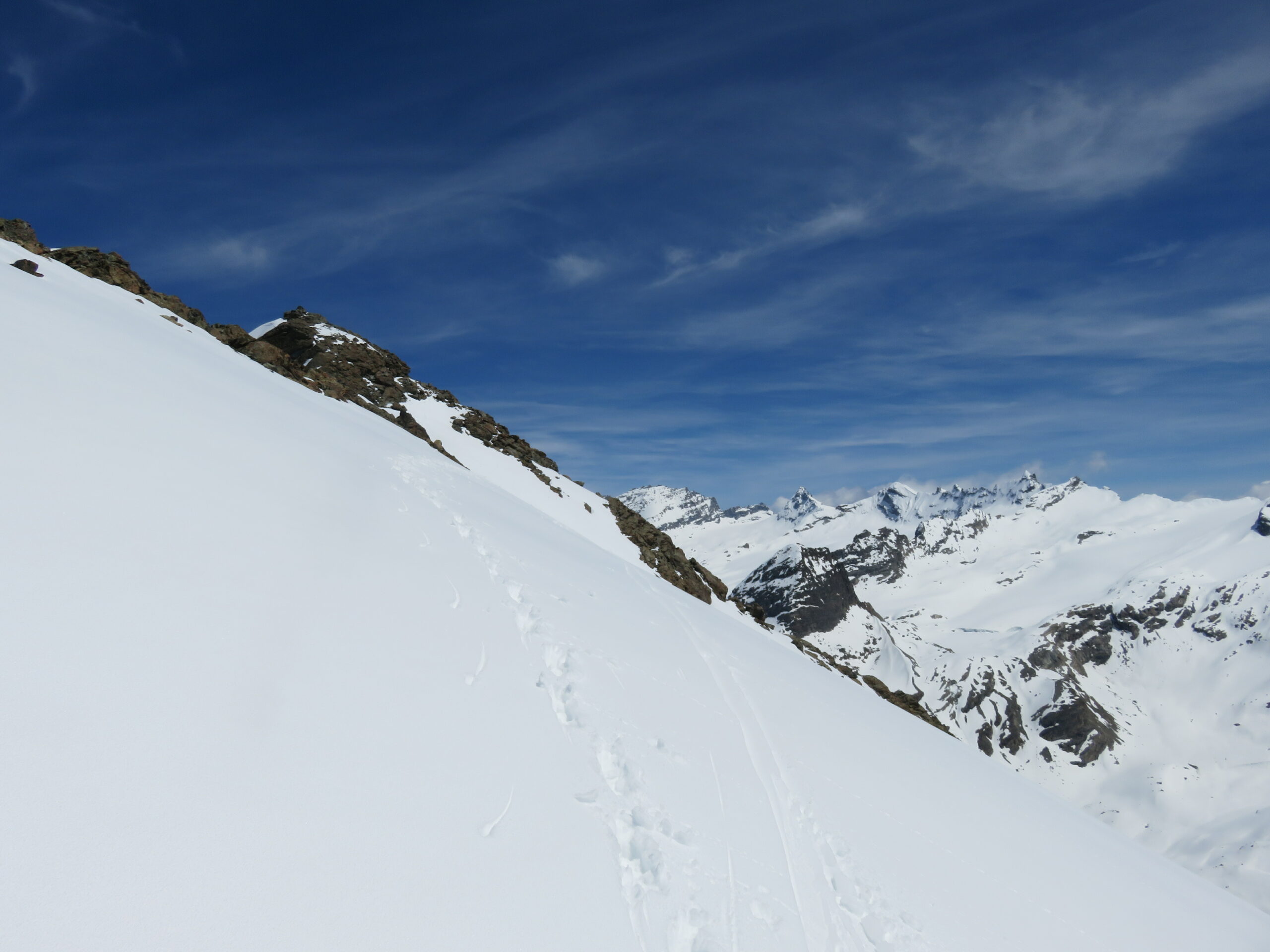 Versante di circa 300m, pendenze intorno ai 40° con tratti a 45°.