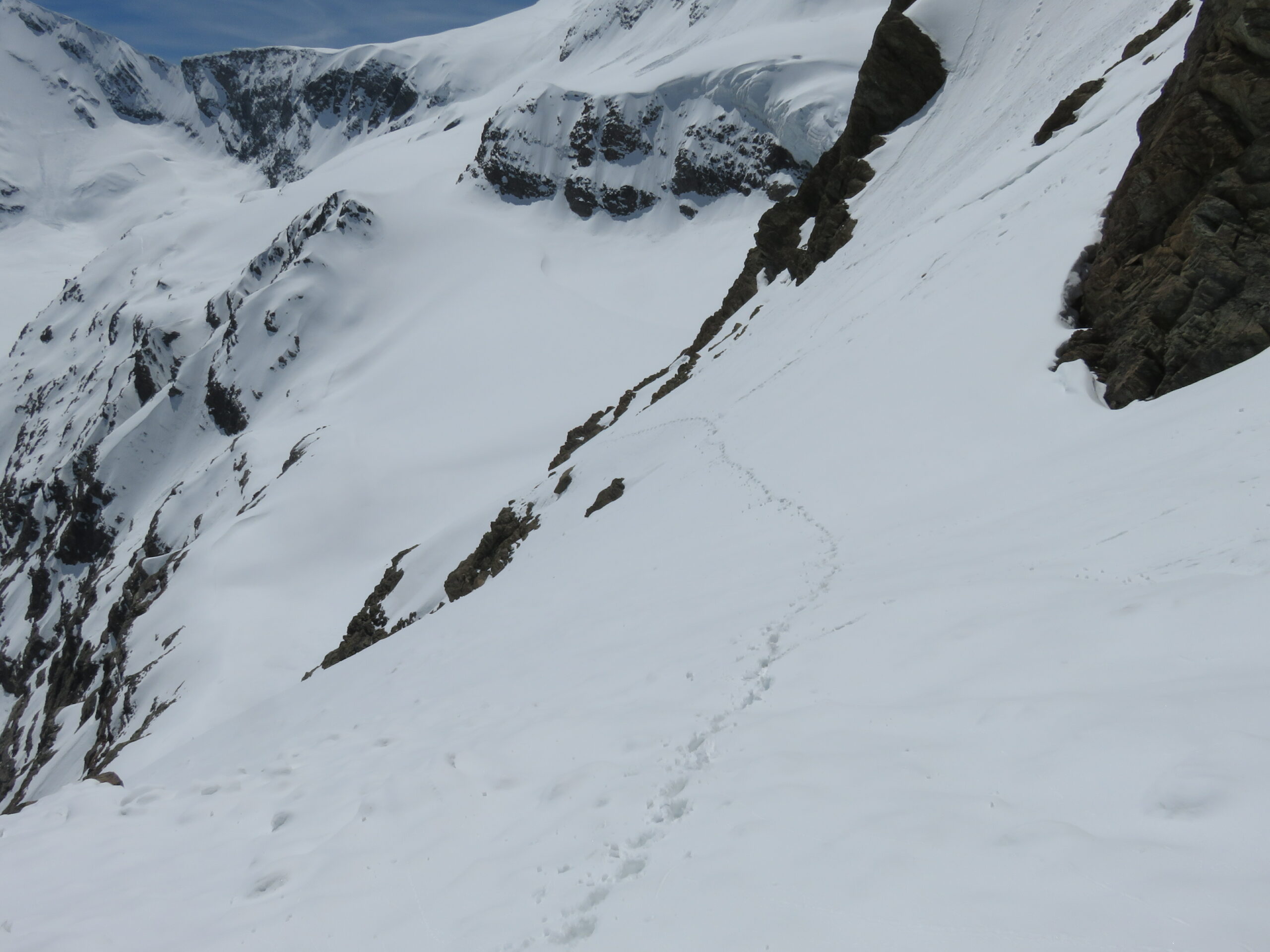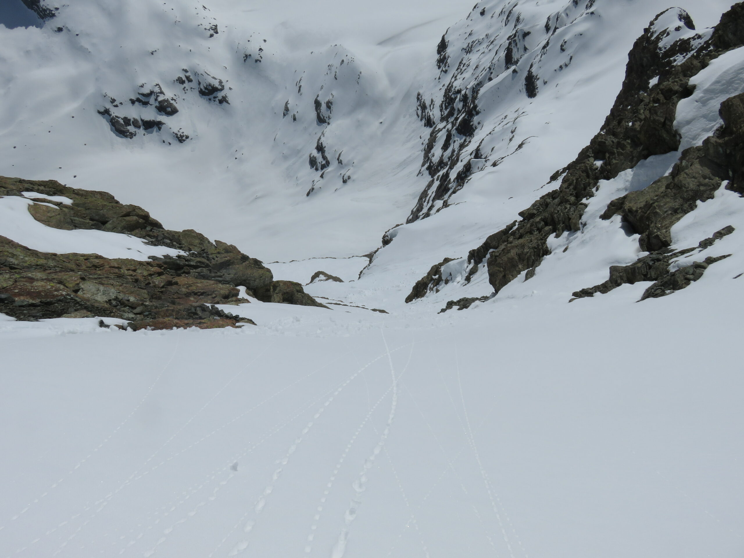 Discesa lungo l’itinerario di salita. A base parete si taglia tutto a dx per tornare nella conca sotto il col du Greffier, che si raggiunge con un ripellino di 100m scarsi. Una volta al colle, si scende il suo canale Nord percorso in salita.