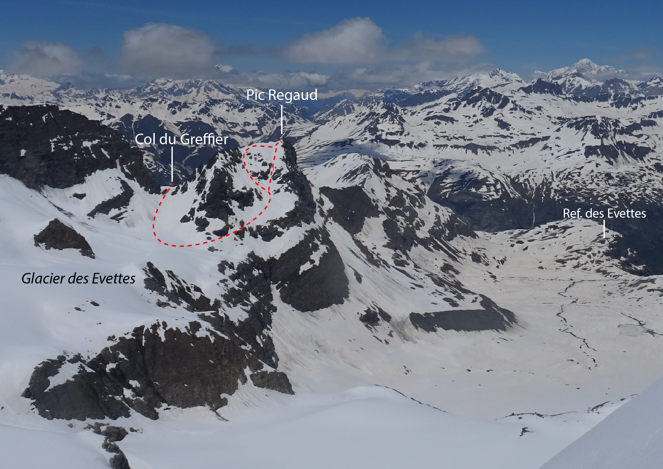 Da Bonneval risalire le piste (percorso in comune con il classicissimo Albaron dal Gl. Sup. du Vallonet). Giunti nella grande conoide a monte dell’arrivo degli impianti, abbandonare la traccia per l’Albaron e dirigersi in piano verso il Col du Greffier (ben evidente davanti). Risalire il Glacier Inferieur du Vallonet generalmente in dx idrografica, quindi spostandosi ancora a sx si raggiunge la base del canale del Greffier, che si risale a piedi (100-150m a 40° e cornice con tratto più ripido in uscita). Dal colle, scendere verso Sud (corda fissa in caso di scarso innevamento), perdendo circa 100m fino ad un pianetto a q. 3000m (margine settentrionale del Gl. des Evettes). Piegare quindi decisamente a sx per passare una dorsale e quindi iniziare una diagonale ascendente verso il centro della parete SE del Pic Regaud. Raggiunto un ripiano a ca. 3050m, prendere a salire con decisione verso sx (E), in direzione della vetta. Qui è possibile percorrere due itinerari: 1) canale di sx, generalmente più ricco di neve e con pendenze tra i 40-45° su 150m circa. Si esce in cresta e da lì si taglia verso dx (esposto) fino alla vetta, oppure 2) canale di dx, ben evidente ed incassato in una breve parete rocciosa (più stretto e quindi spesso più povero di neve). Si risale la breve conoide e poi il canalino ripido (45° costanti) che solca la parete fino ad uscire sul pianetto sospeso sotto le roccette di vetta (dove arriva da sx l’opzione 1). 5-10m di roccette facili portano alla panoramicissima vetta.