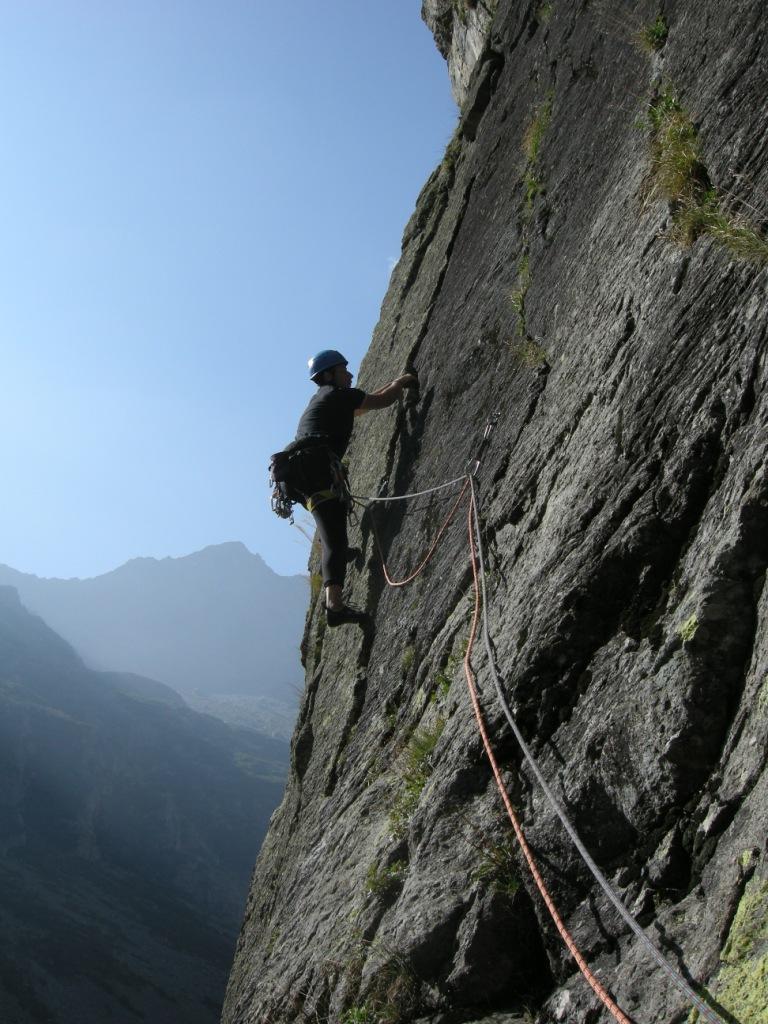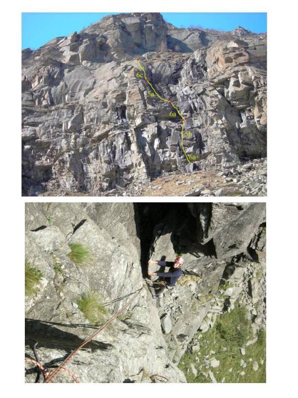 Affrontare la fascia di tetti soprastante sul bordo destro della stessa ed issarsi al di sopra di essa grazie ad un gigantesco blocco incastrato che ostruisce il gigantesco diedro nerastro soprastante 6a+ (un po’ disturbati dai licheni). Vincere un muretto con prese arrotondate e sostare alla base di una grande placca nera S2. Traversare a sinistra in esposizione e raggiungere la radice di una bella fessura che caratterizza tutta la lunghezza. Salirla con bellissima arrampicata 4c e 5a e sostare alla base di un muretto rossastro S3. Ripartire per il muretto strapiombante e con duro passaggio ribaltarsi sulla placca superiore 6b+ . Continuare con arrampicata delicata sulla placca più abbattuta 5b e uscire sulla terrazza erbosa terminale.