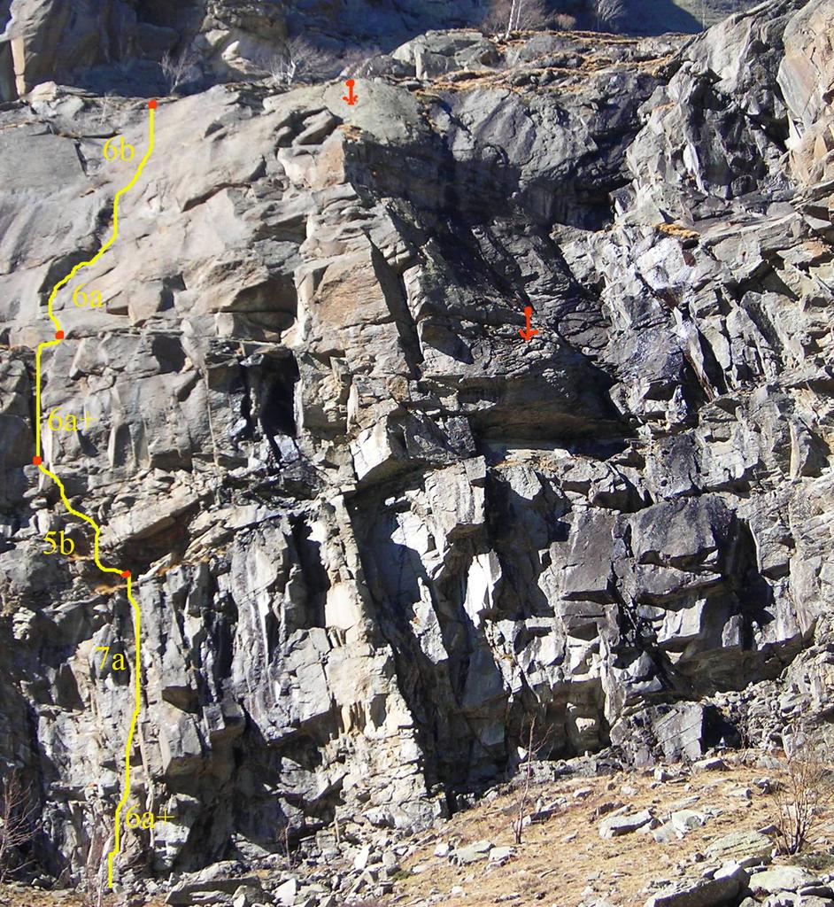Peccato che l’uscita molto sporca del primo tiro penalizzi la riuscita del passo chiave a vista, poichè l’appiglio determinante per uscire è assai sporco di muschio. Ora l’abbiamo un pò ripulito ma ci vorrebbe una bella spazzolata.