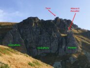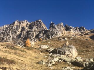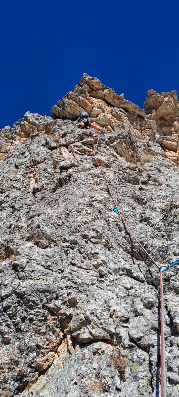 Dalla sommità, doppia di circa 20-25 m, poi si traversa una settantina di metri verso dx (faccia a monte), fino alla base della seconda struttura.