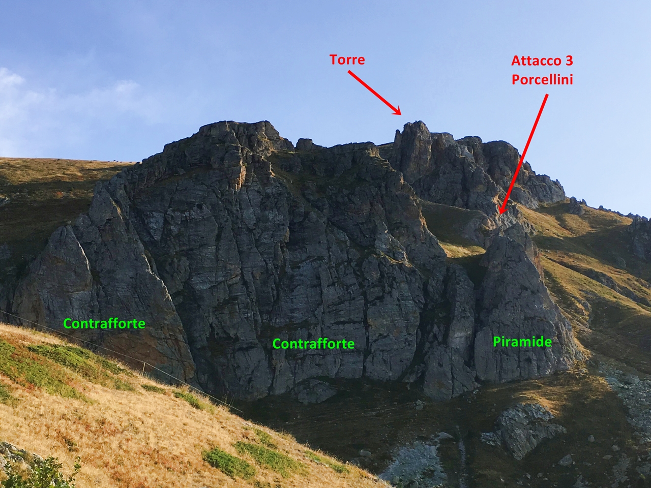 Per trovare l'attacco conviene fare riferimento alla visibile Torre su cui corre la via La Puncho: Tre Porcellini si trova a dx (faccia a monte) e leggermente più in basso rispetto alla base della suddetta torre. Se non si è pratici, si consiglia di fare riferimento anche alle immagini con tracciato allegate (proprietà dell'apritore).