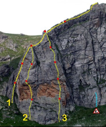 - L2 salire verticalmente la fascia arancione. La sosta si trova leggermente a destra della linea di salita, nei pressi di un comodo terrazzino (attenzione a non saltarla). 6b+ 35 m
