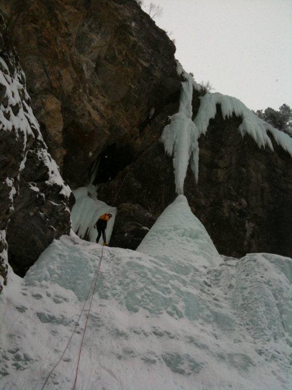 un primo salto a 80° (1 o 2 lunghezze a piacere) conducono sotto la magnifiche due colonne sovraposte che si salgono in due lunghezze 90°-100° (a seconda degli anni).