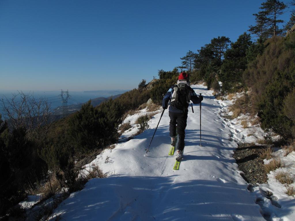 Gran bella traversata per assaporare il contrasto tra la macchia mediterranea ad inizio gita e le faggete tipicamente invernali del versante nord. Partiti da sopra Arenzano (località Curlo a circa 270m), messi gli sci dopo poco più di mezz’ora, poi 2 o 3 metti e leva. Poi neve continua da quando si è in vista del Colle della Gava. Forte vento come al solito, specialmente in punta. Due discese a nord ripellando, la prima fino alla confluenza dei ruscelli, sempre su neve da favola. 40cm di farina sontuosa su fondo duro nei boschi coperti dalla Galaverna. Uno sballo. Dal Faiallo scesi lungo la strada (il primo pezzo purtroppo spingendo per troppa farina pressata) e passando dalla mulattiera a nord (la strada del sale) arrivati alla sbarra del blocco stradale dove al mattino avevamo portato un’auto. A sud la neve non è ancora trasformata. Giornata spaziale con assenza di vento solo nei boschi. Alla fine quasi 1400 metri di dislivelli. Sfruttando gli itinerari sciistici del Reixa è una gita che richiede allenamento. Visto delle tracce sul Malanotte. Con Tonino a dividere l’impegno e il battere traccia.
