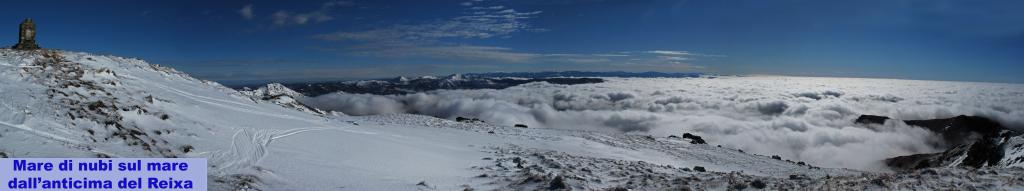 Gran giornata per godere di panorami intriganti come il mare di nubi su tutta Genova di primo mattino. Verso le 12 la maccaia risaliva anche i crinali del Reixa, mentre si apriva il cielo sulla costa genovese. A nord sempre sole. Ieri sono caduti altri 10-20 cm di neve tanto da cancellare le tracce dei giorni scorsi. Per cui tutto intonso nelle radure. Gran neve a nord, mentre il Malanotte ha regalato ottime sciate fino a metà mattinata. Poi il caldo si faceva sentire. In vetta assenza di vento e temperatura finalmente di primavera. In cresta poca neve per il vento dei giorni scorsi. Io son partito solo, ma c’era una gran rappresentanza dello sci alpinismo locale, intendo quello amatoriale, nel senso affettivo verso questi monti. Buona Pasqua a tutti