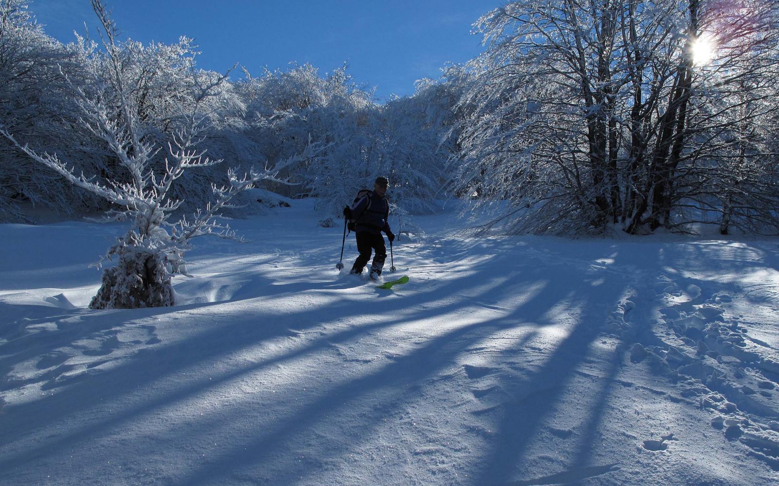 Reixa sontuoso. Dopo un Pavaglione e 2 Costa Lavezzara era d’obbligo salire al Reixa, anche se è stato necessario passare da Tiglieto perché il Faiallo lato Genova è chiuso e lo sarà anche nel prossimo week-end, almeno a detta degli addetti ai lavori. La scintilla è nata quando ieri dopo cena a Genova si è scatenato il diluvio e la temperatura in città è scesa a 5 gradi. Stamattina in una giornata spaziale (un po’ di nuvole di crinale a metà giornata) e senza vento, il Reixa presentava uno scenario incredibile con almeno 30 cm di farina caduta nella notte. Siamo scesi 3 volte a nord e ad ovest con i primi pendii favolosi con crosta portante e poi farina nel bosco, a tratti ventata, e umida nei tratti al sole. Nel mezzo ciliegina sulla torta con il Canale Malanotte sceso fino alla forra su neve gessata su fondo preesistente duro, ma sciabile. Non speravamo tanto. Ambiente leggiadro. Solo noi e tutto vergine. Solo un gruppetto è salito a piedi lungo la via normale. Con Gil e Tonino