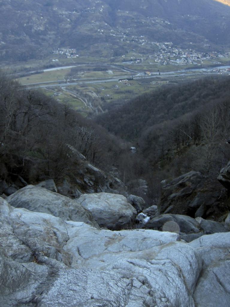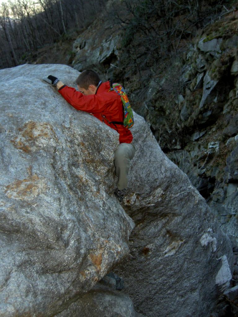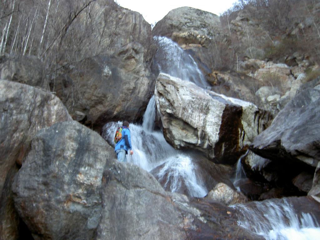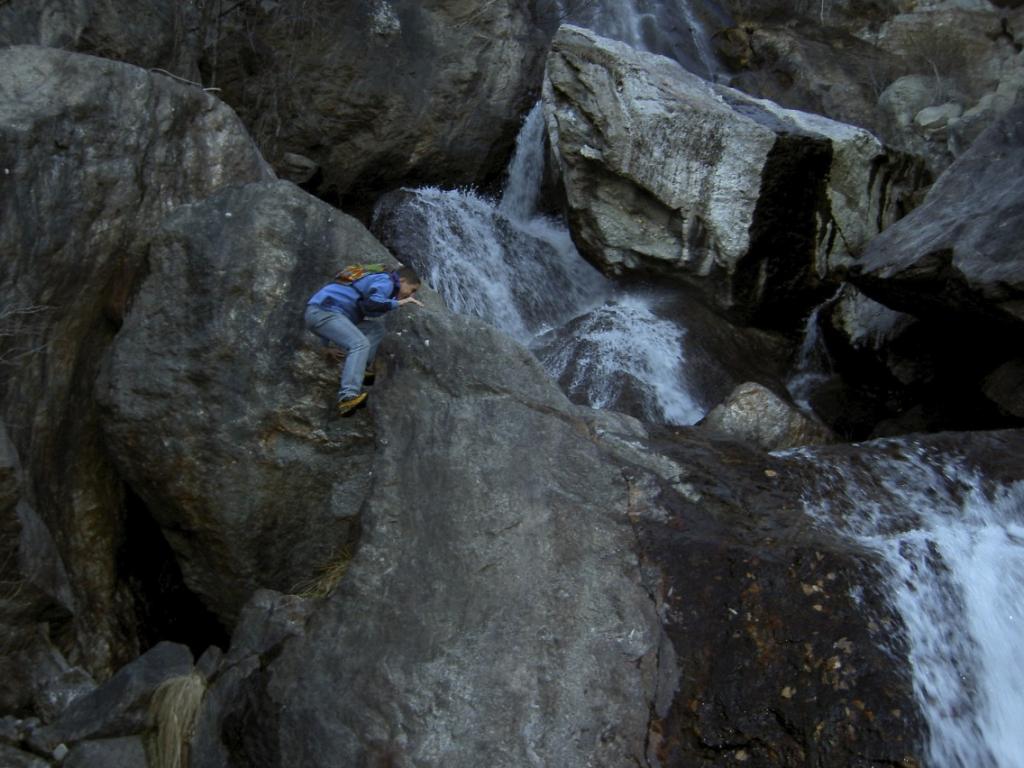 -La prima di 45m. La si aggira completamente a destra uscendo dall’alveo, arrampicandosi prima tra rocce ed alberi poi camminando su lisce placche che portano appena sopra l’inizio della cascata, su cui si scende disarrampicando e si traversa il rio.