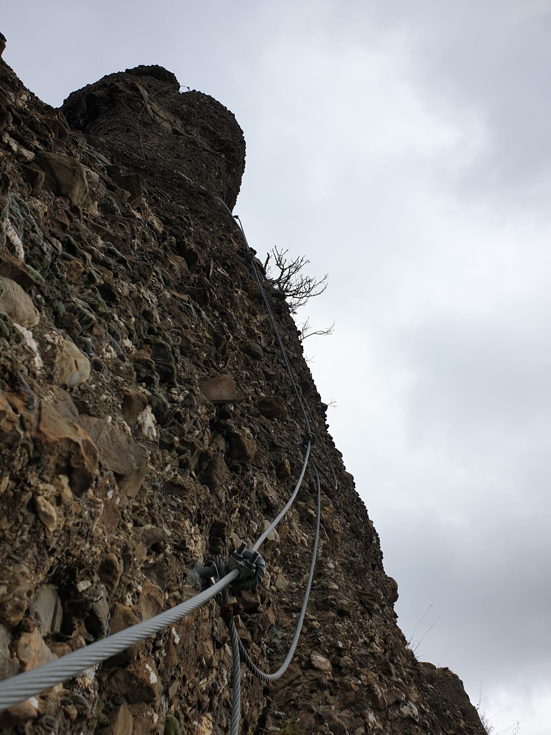 La faccio spesso ed è sempre stupenda e impegnativa (D). Bisogna saper usare bene i piedi per non stancare le braccia perché non ci sono staffe ma solo uno o due cavi d’acciaio. Ogni settore ha una parte impegnativa strapiombante di qualche metro, dove passare decisi perché richiede anche un certo impegno di braccia. Per i principianti, consiglio eventualmente di avere una longe per appendersi e riposare le braccia. La zona ha diverse parti esposte, anche durante i trasferimenti, quindi prudenza. Casco sempre ben indossato perché il conglomerato non è solidissimo. Tempistica media sulle 4 ore andata e ritorno da posteggio a posteggio.