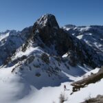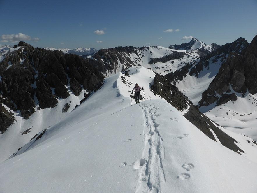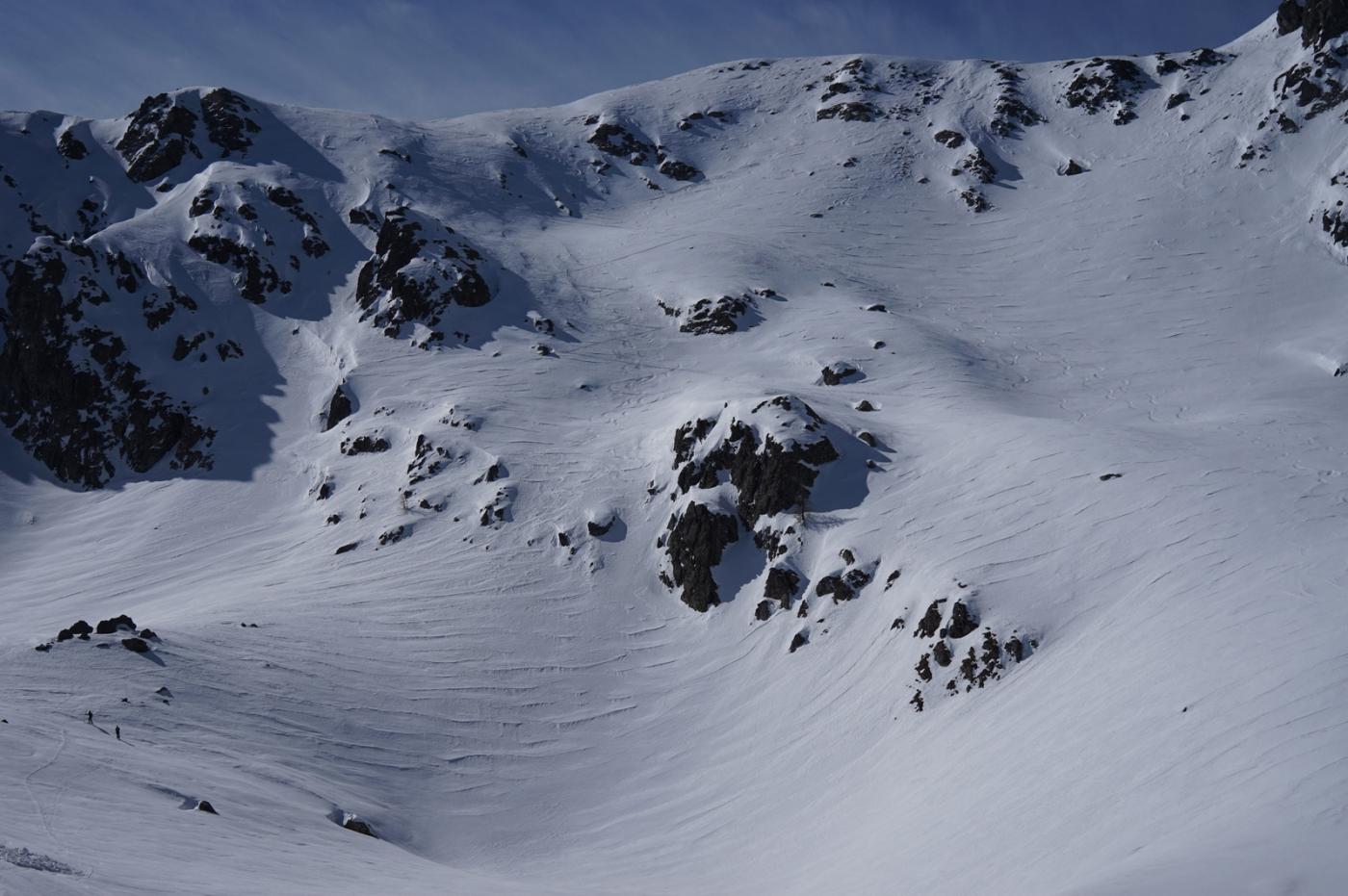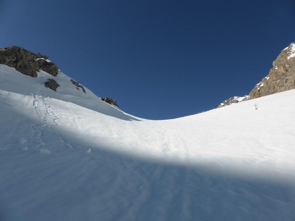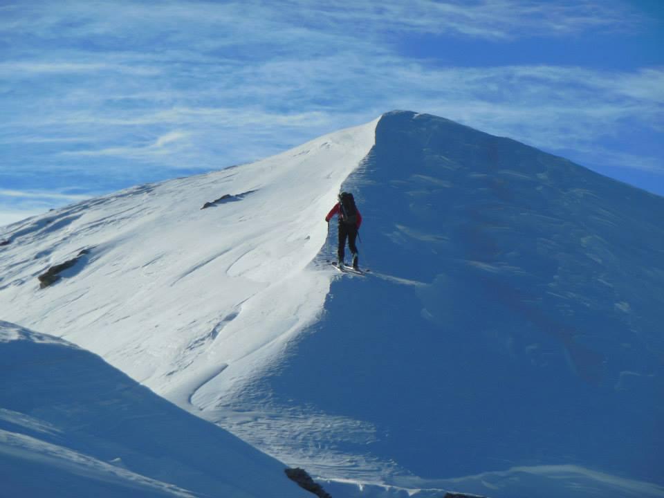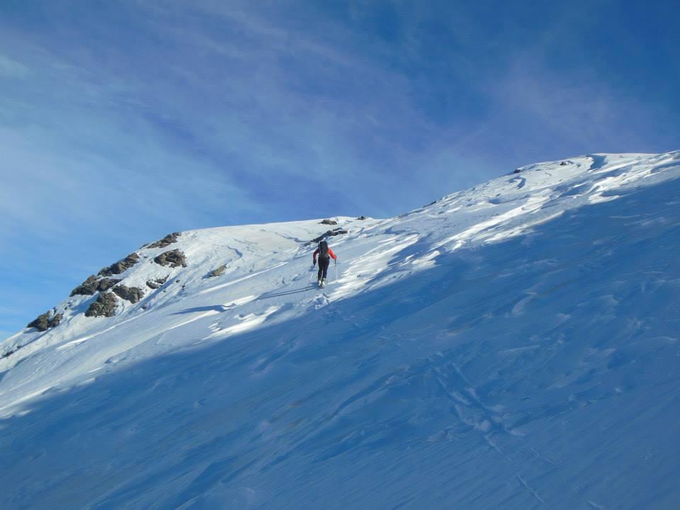 Sulla sx della caserma si apre un valloncello fra il Cobre e la Rocca Peroni che con andamento sinuoso e alcuni strappi porta nell’isolatissima conca sotto la cima. Il ripido pendio terminale si affronta meglio se preso un po’ più a sx.della verticale alla vetta.