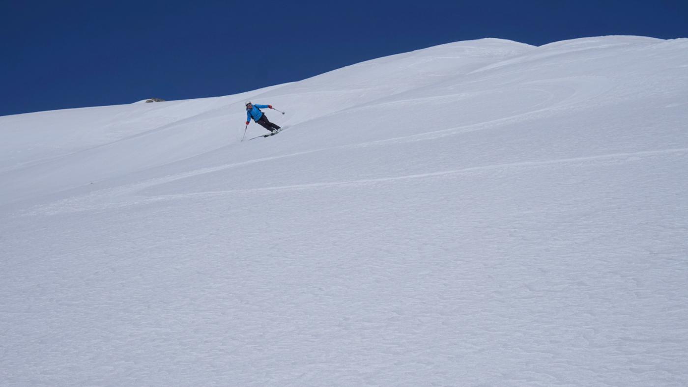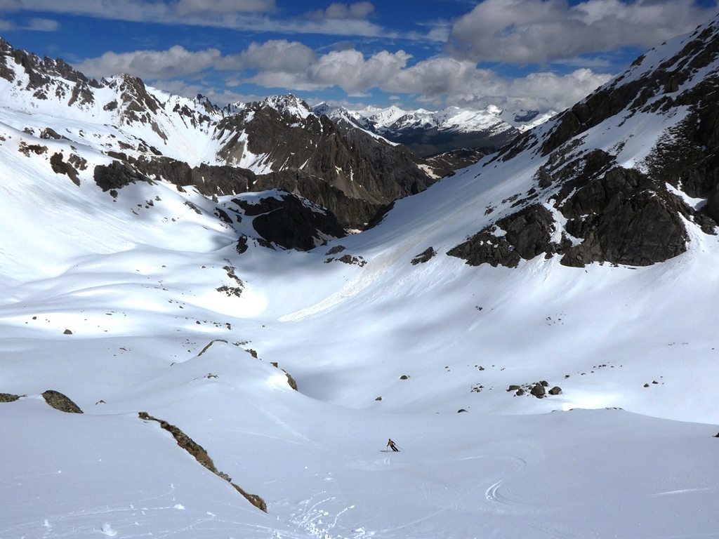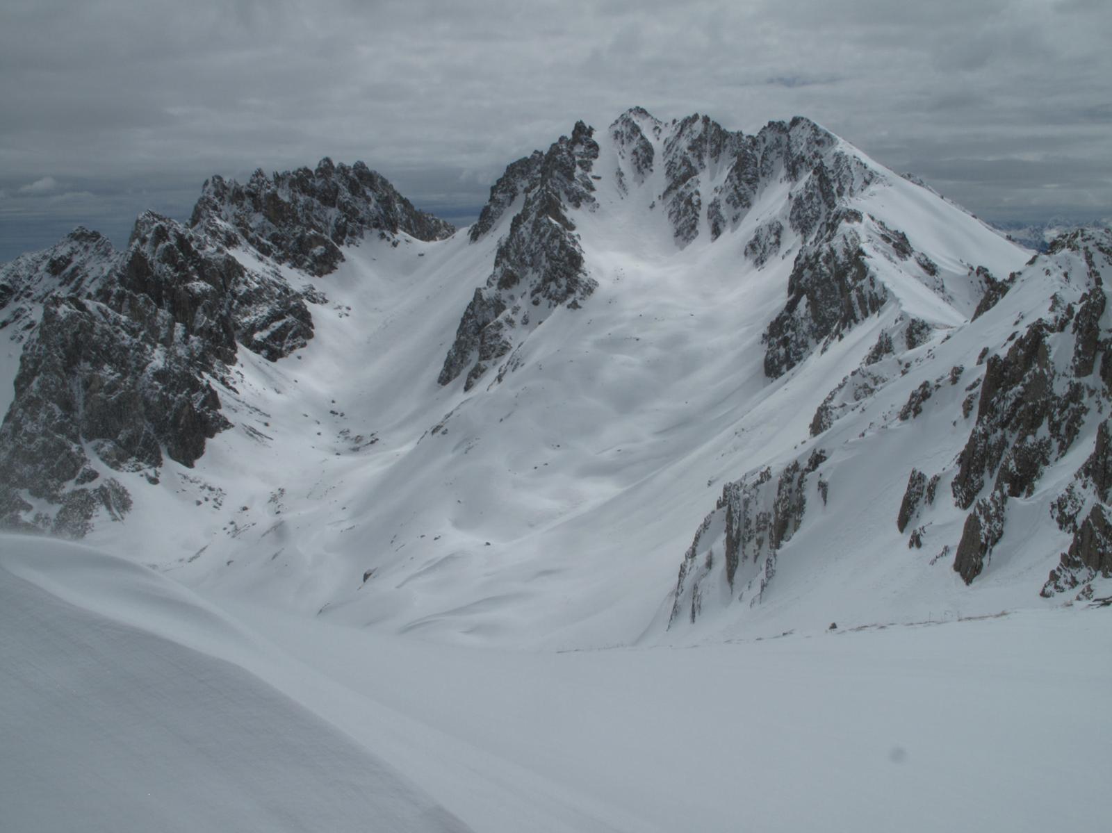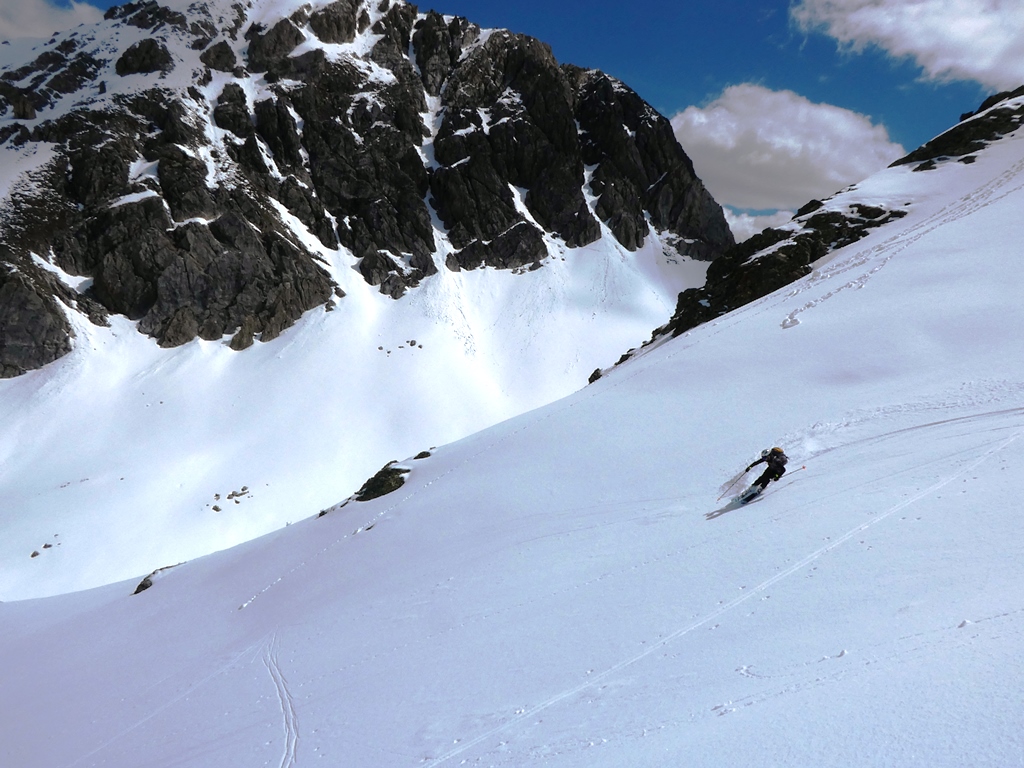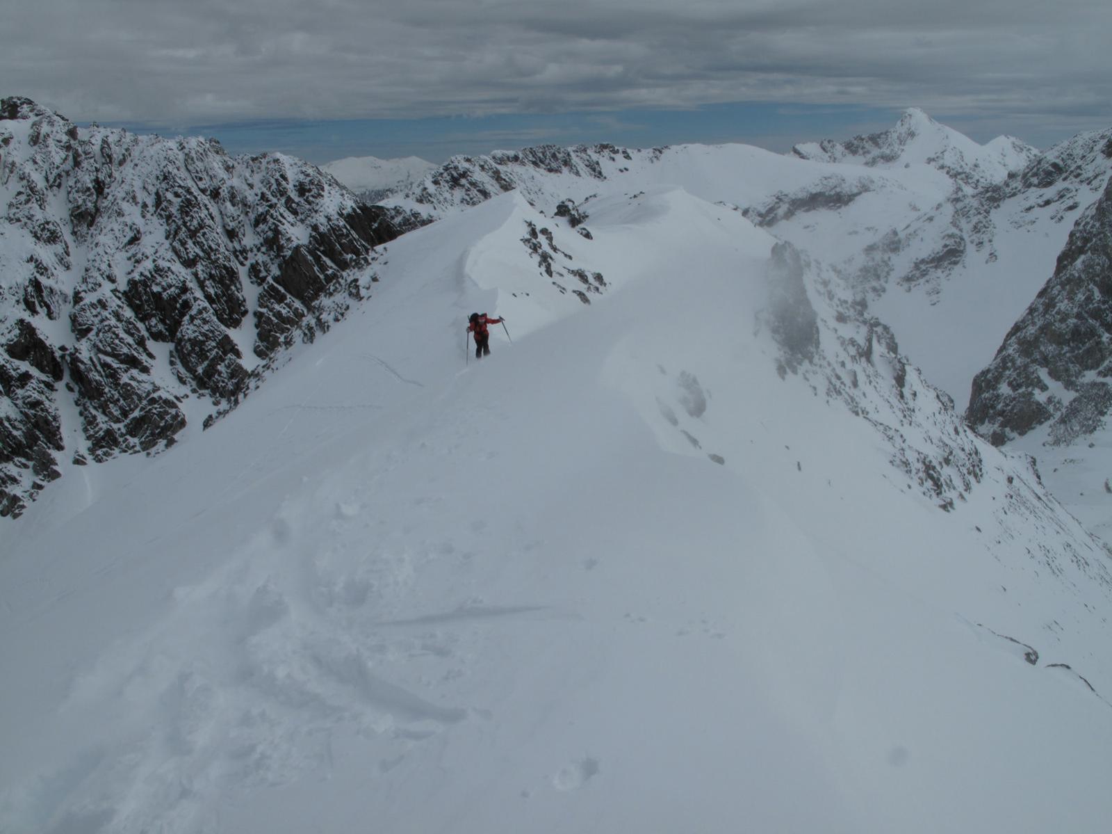 Sulla sx della caserma si apre un valloncello fra il Cobre e la Rocca Peroni che con andamento sinuoso e alcuni strappi porta nell’isolatissima conca sotto la cima. Il ripido pendio terminale si affronta meglio se preso un po’ più a sx.della verticale alla vetta.