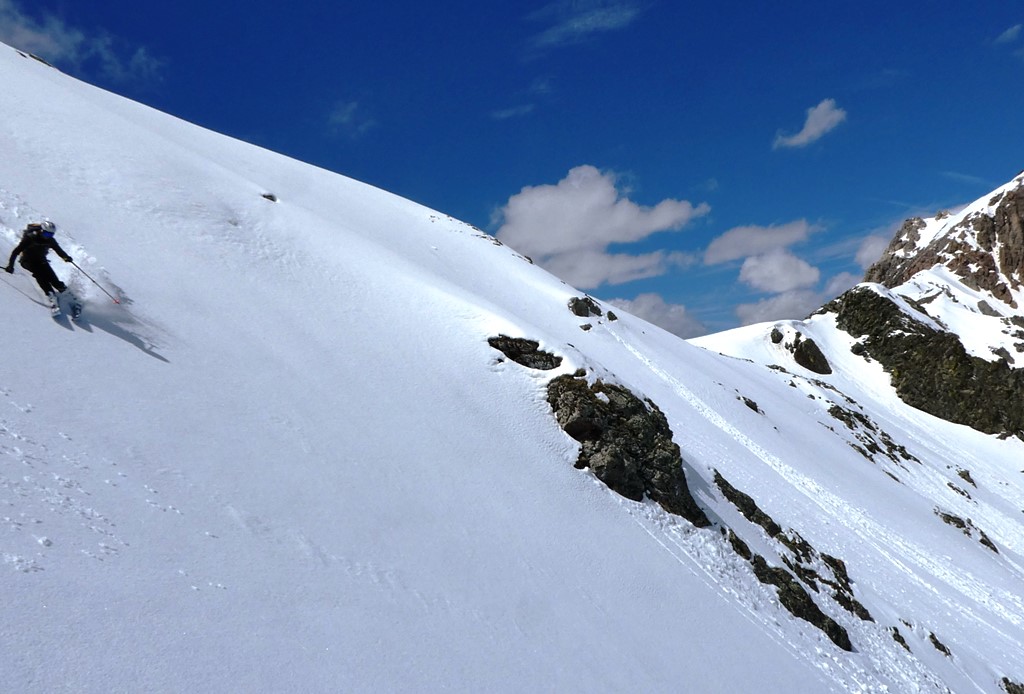 Partenza dal bivio x il Ciarbonet, con portage di 10-15′ che, volendo, si può azzerare in quanto la sterrata è pulita sino al ponticello prima di Pratociorliero, dopo di che si possono calzare gli sci, salvo il breve tratto del pianoro, poi neve continua, stamane con buon rigelo. Oltre i 2100 ottimo innevamento. Salito prima il pendio-canale di dx (NE), discesa su neve appena rinvenuta sino alla base del conoide ovest del Cobre. Ripello per il pendio di sx. (Nord) e seconda discesa su neve dura con una spruzzata di farinella della sera precedente. Rientro meglio del previsto con la neve “rossa” in basso che ha tenuto bene sino a Pratrociorliero.