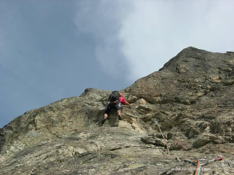 Si raggiunge un ancoraggio per la doppia (20 m) ci si cala nel canale, si supera una lunghezza facile (III+) e si attacca una bella parete a dx. sul bordo di un enorme tetto, con due lunghezze (V+/A0,V+) si arriva all’apice del tetto (sosta 6 per doppia impressionante); da qui con altre 6 lunghezze si arriva in cima allo sperone.