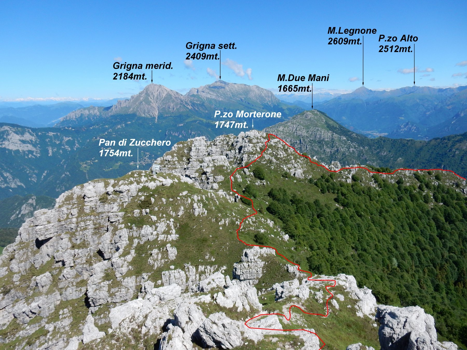 Su percorso meno ripido si scende, per poi risalire al Pan di Zucchero 1754 m e da questo, tra sali e scendi, si tocca in ultima la cima del Pizzo Morterone 1747 m.
