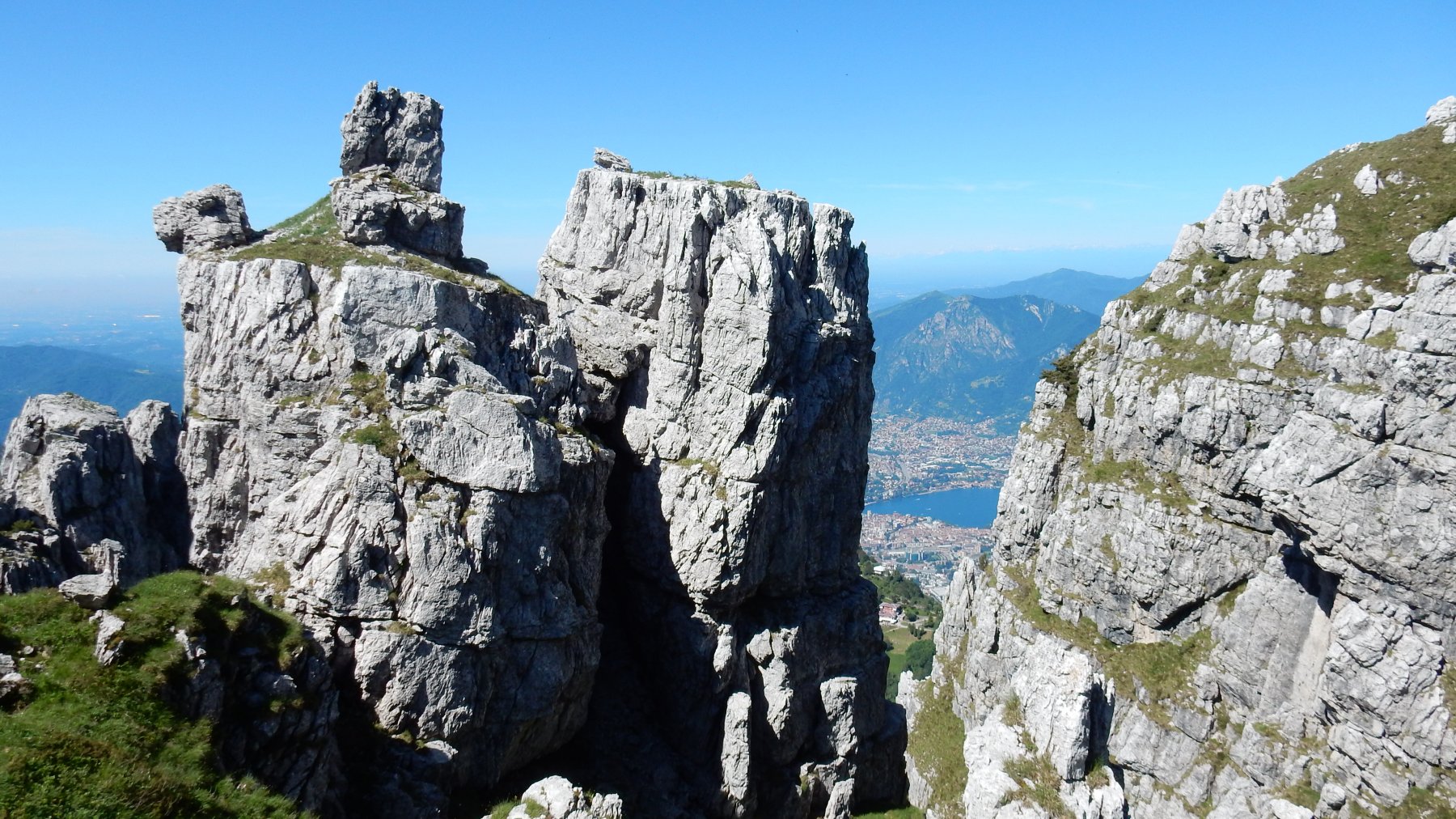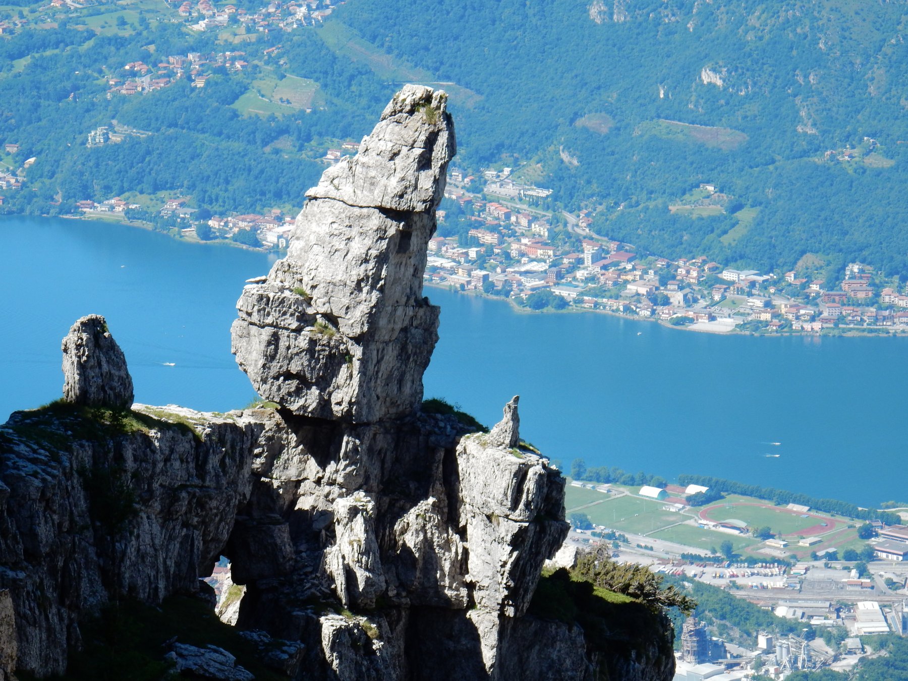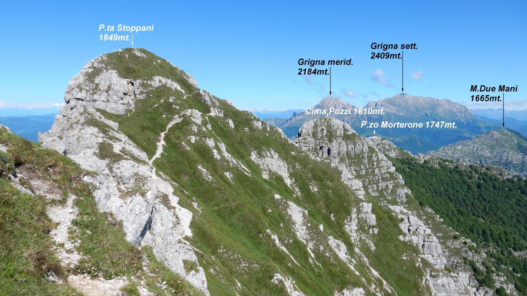 Dopo la netta discesa dalla Cermenati, dove si raggiunge la sella del canale Comera, si risale la ripida crestina della Punta Stoppani 1849 m con crocina, procedendo poi per la sucessiva Punta Manzoni 1810 m.